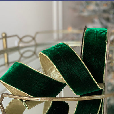 Red Crystal & Green Sequined Holly Red Velvet Ribbon with Gold Backing