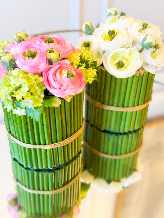 Ranunculus And Snowball In Bamboo Planter