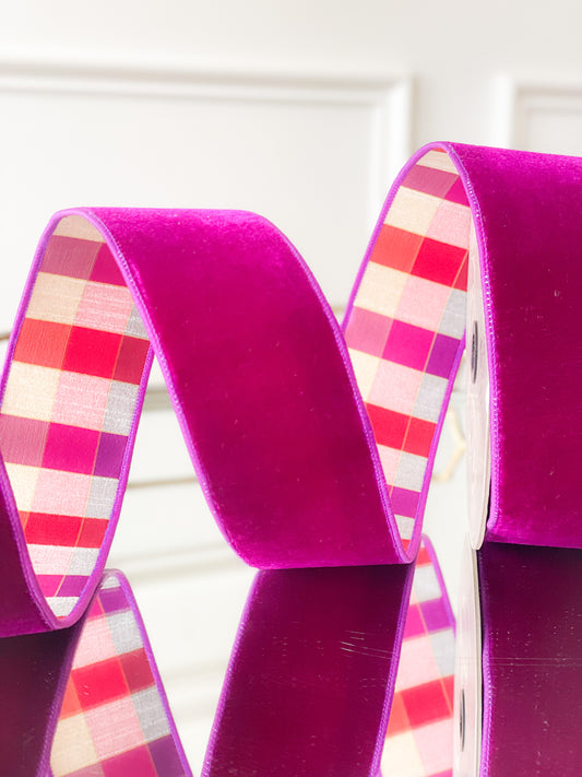 Hot Pink Lush Velvet With Rainbow Plaid Back