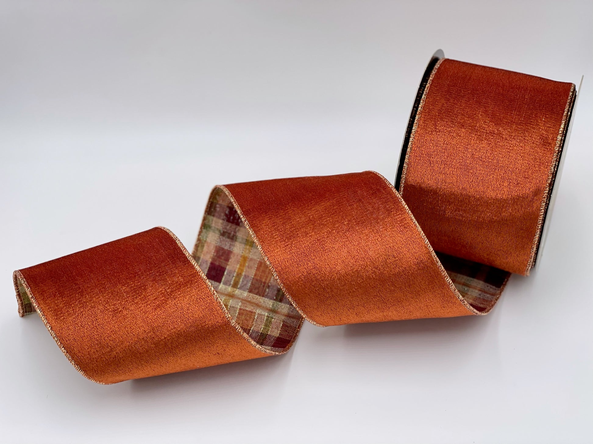 Rust Velvet Ribbon with Plaid Backing & Gold Trim 4 inches x 10 yards