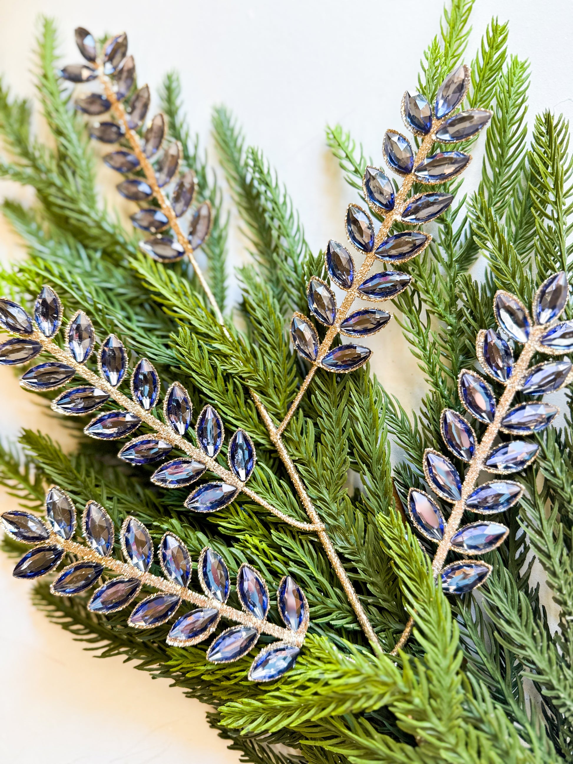 Bring a touch of festive sparkle to your holiday designs with our stunning 22.5-inch Blue Jewel Spray. Each spray features shimmering blue jeweled accents on flexible wired stems, allowing for easy shaping and arranging. Perfect for adding rich texture and vibrant color to Christmas trees, wreaths, garlands, centerpieces, or floral arrangements.