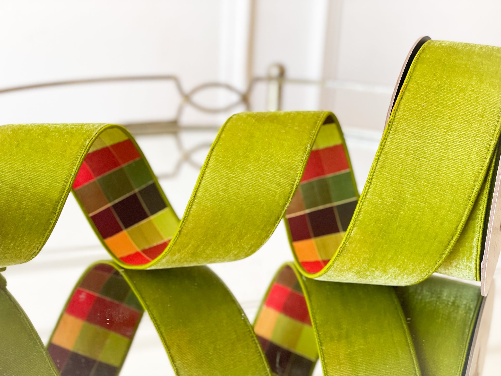 2.5”x10yds Apple Green Velvet Ribbon With Fall Plaid Back