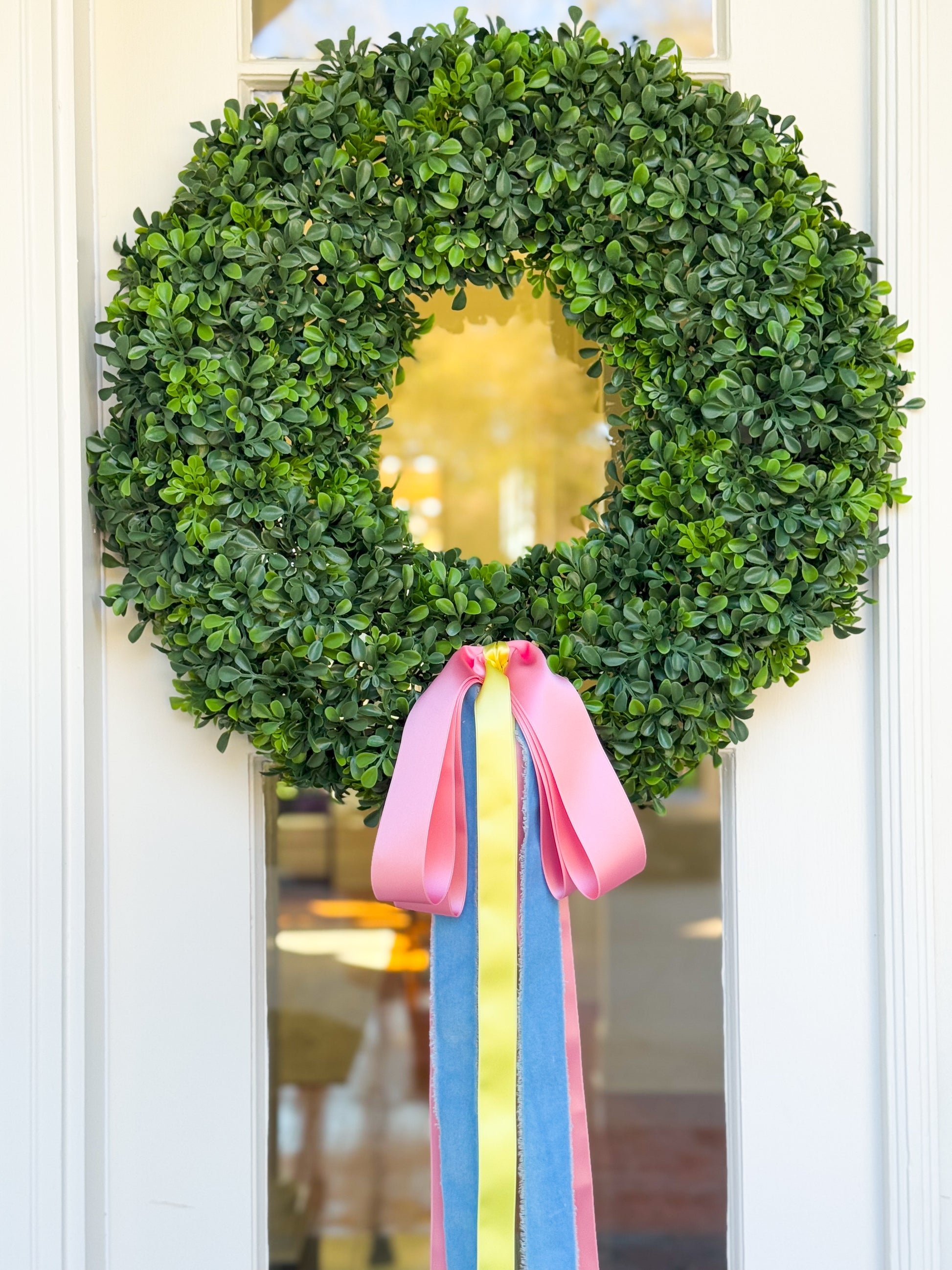 21” Blissful Bow Boxwood Wreath With Layered Ribbon Bow.