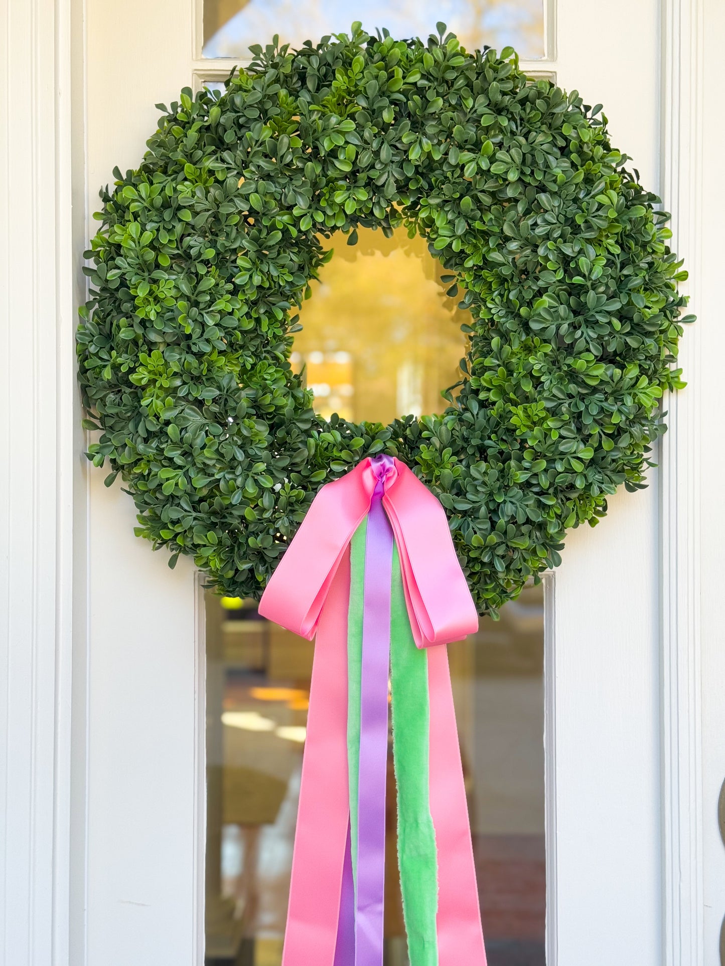 21” Blissful Bow Boxwood Wreath With Layered Ribbon Bow.