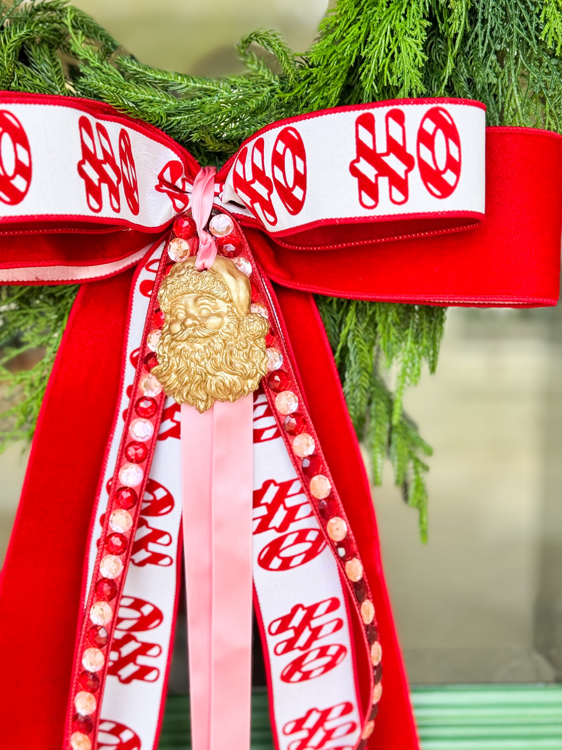 Whimsical meets chic in the Candy Couture Wreath, a festive statement piece that brings designer-level charm to your holiday door. Measuring 26 inches, this lush real-touch mixed Norfolk wreath is styled with a bold red velvet bow and layers of candy-striped “Ho Ho Ho” ribbon, finished with glistening jeweled trim that sparkles like peppermint lights.