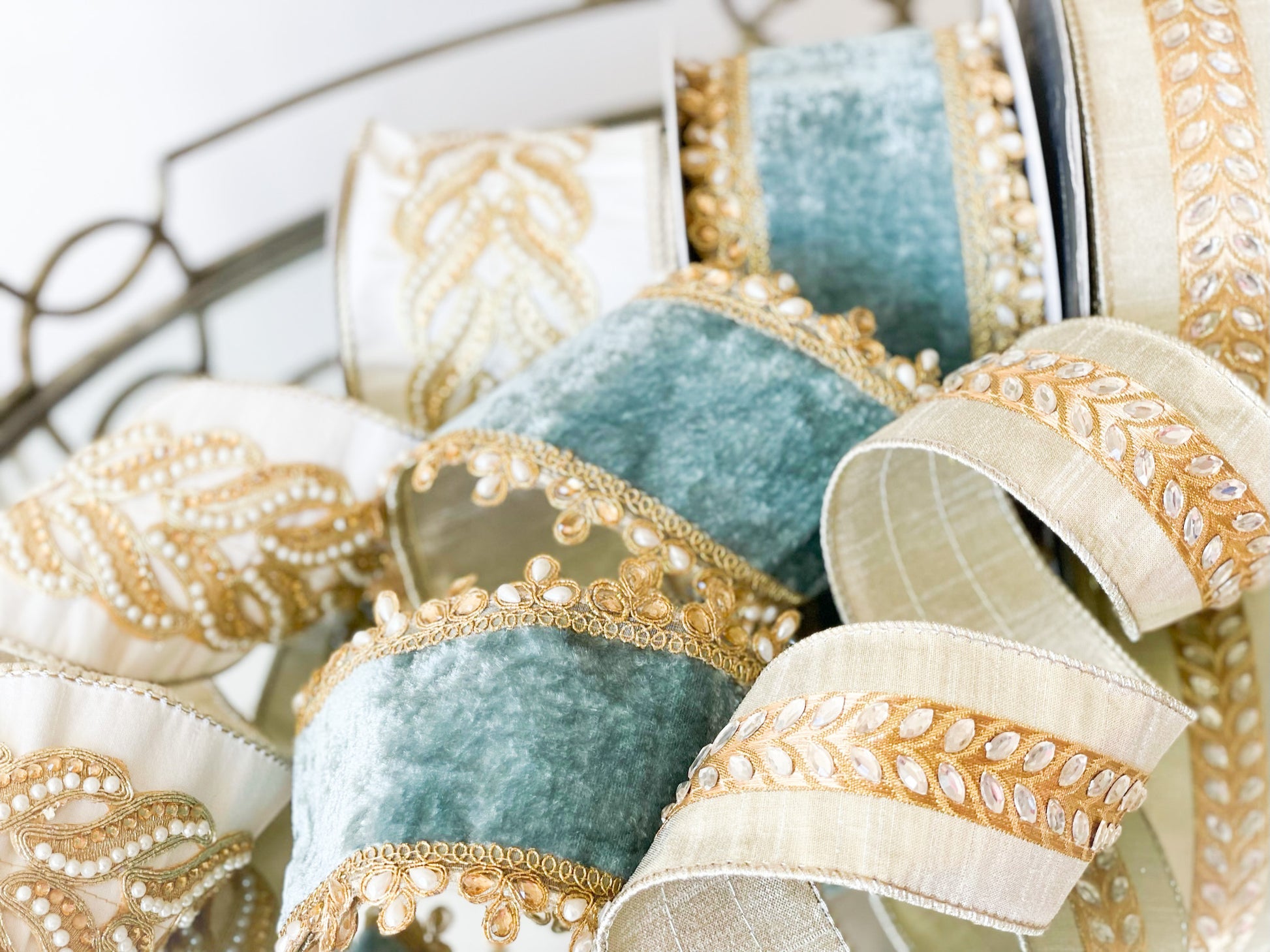 4”x5yds Celadon Velvet Ribbon With Pearl Edge, Wired