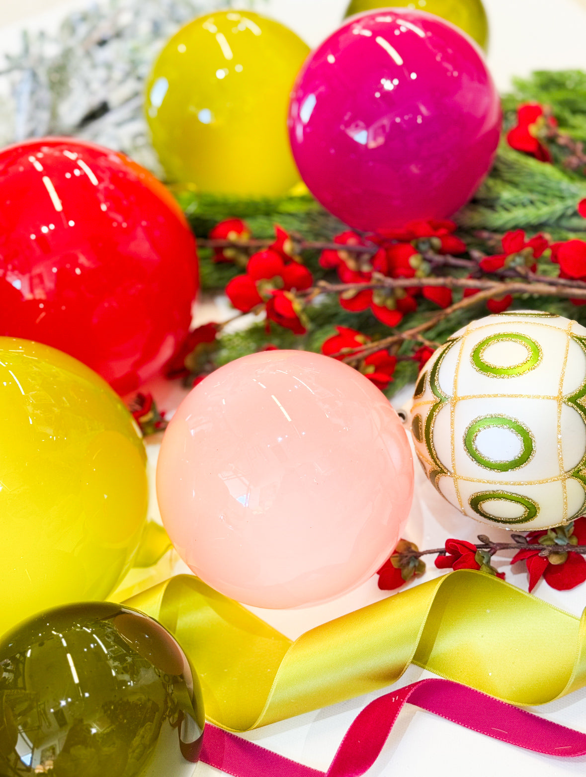 - Assorted oversized glass ornaments in vibrant hues (red, fuchsia, green, chartreuse)