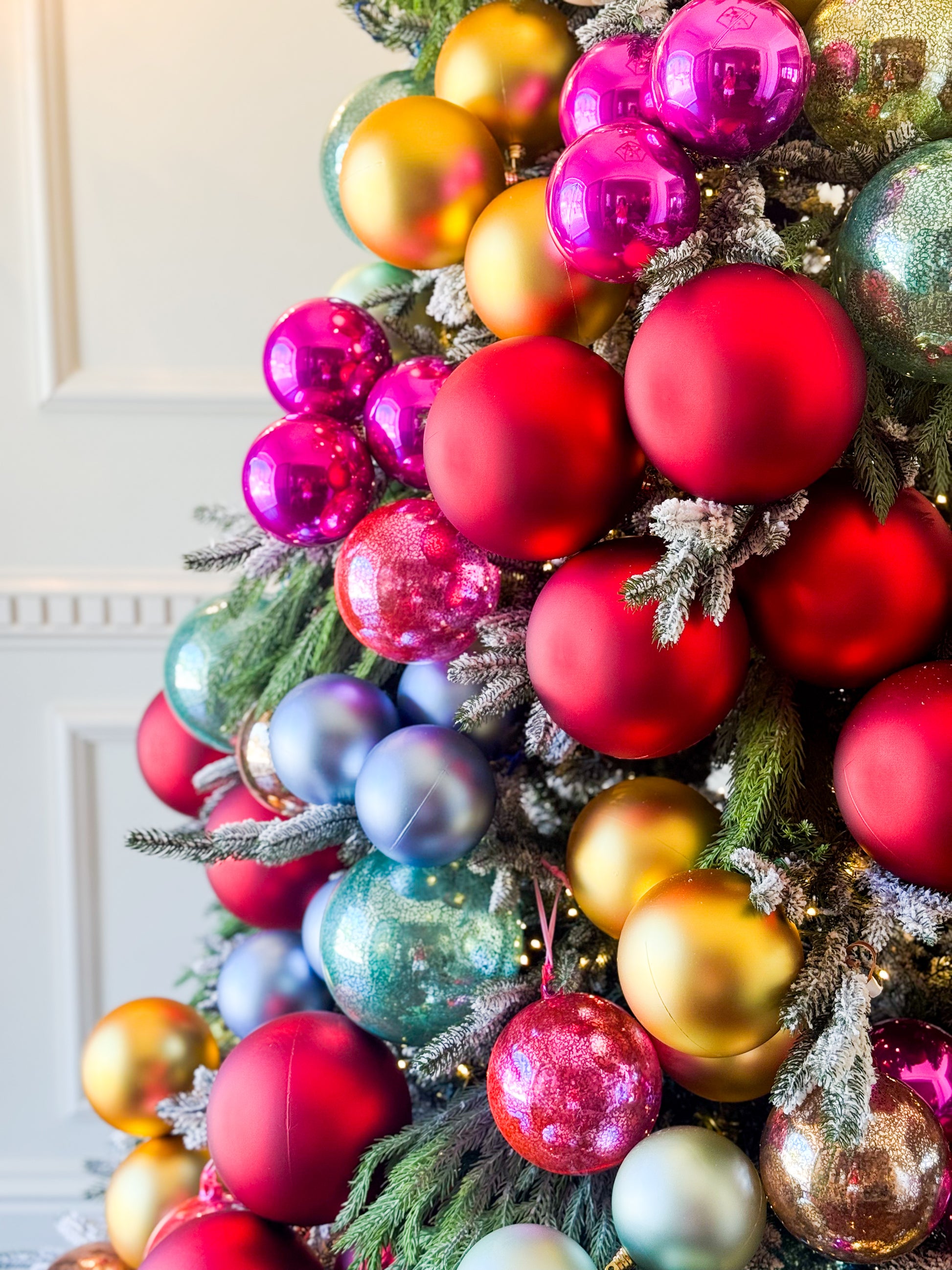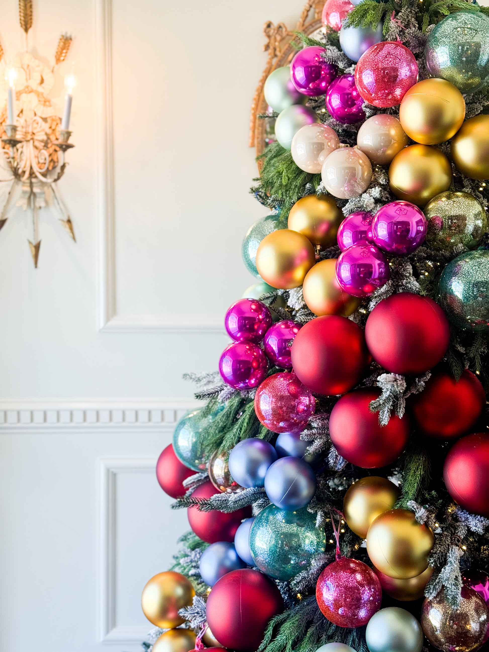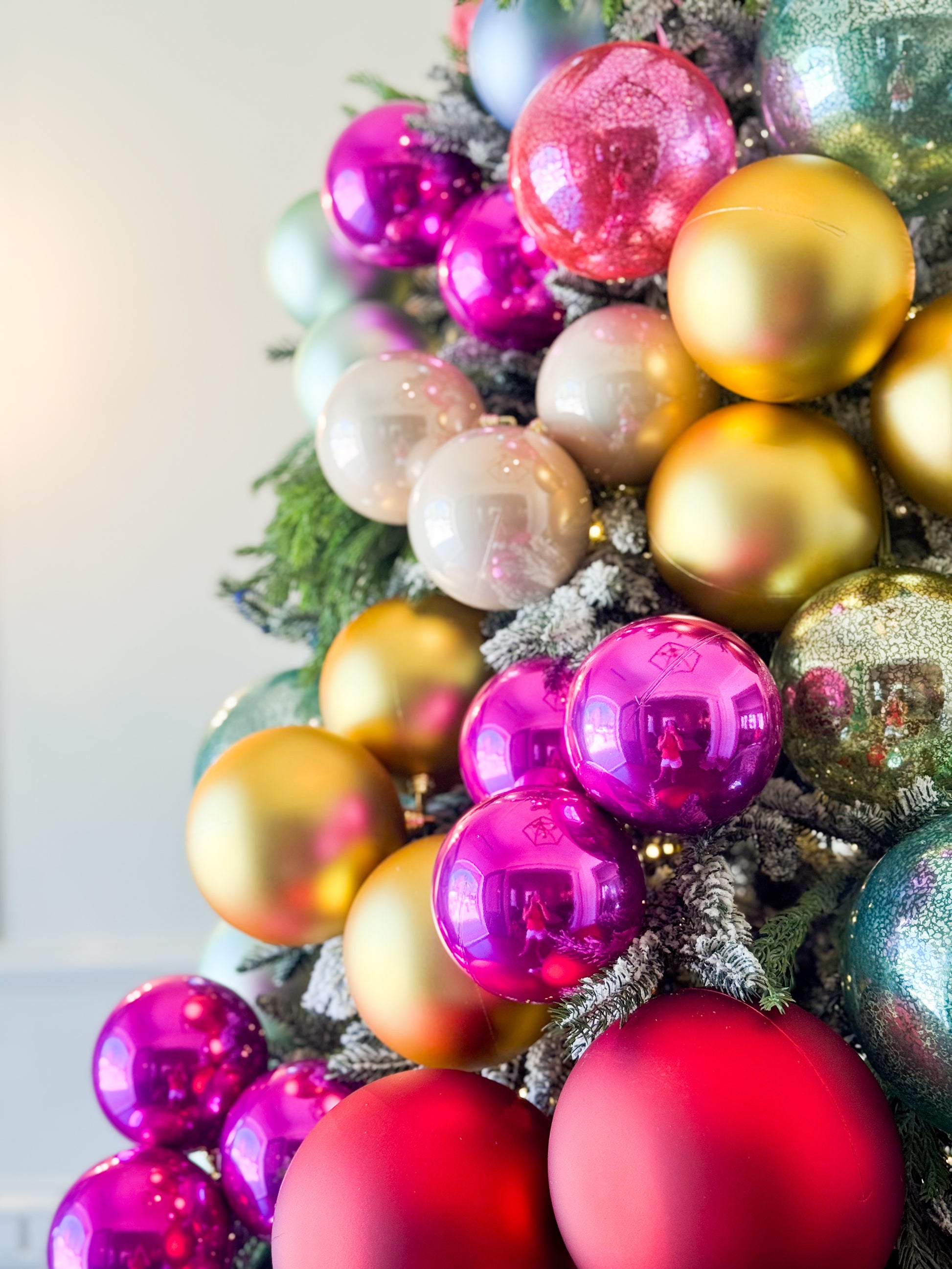 Each box is curated to help you recreate this dazzling, full-bodied design with ease. Layers of oversized ornaments in mixed finishes — glossy, satin, and mercury glass — create a luxurious, high-impact look that’s both joyful and refined. Subtle frosted greenery and warm twinkle lights balance the vibrant tones, transforming your space into a radiant celebration of color and light.