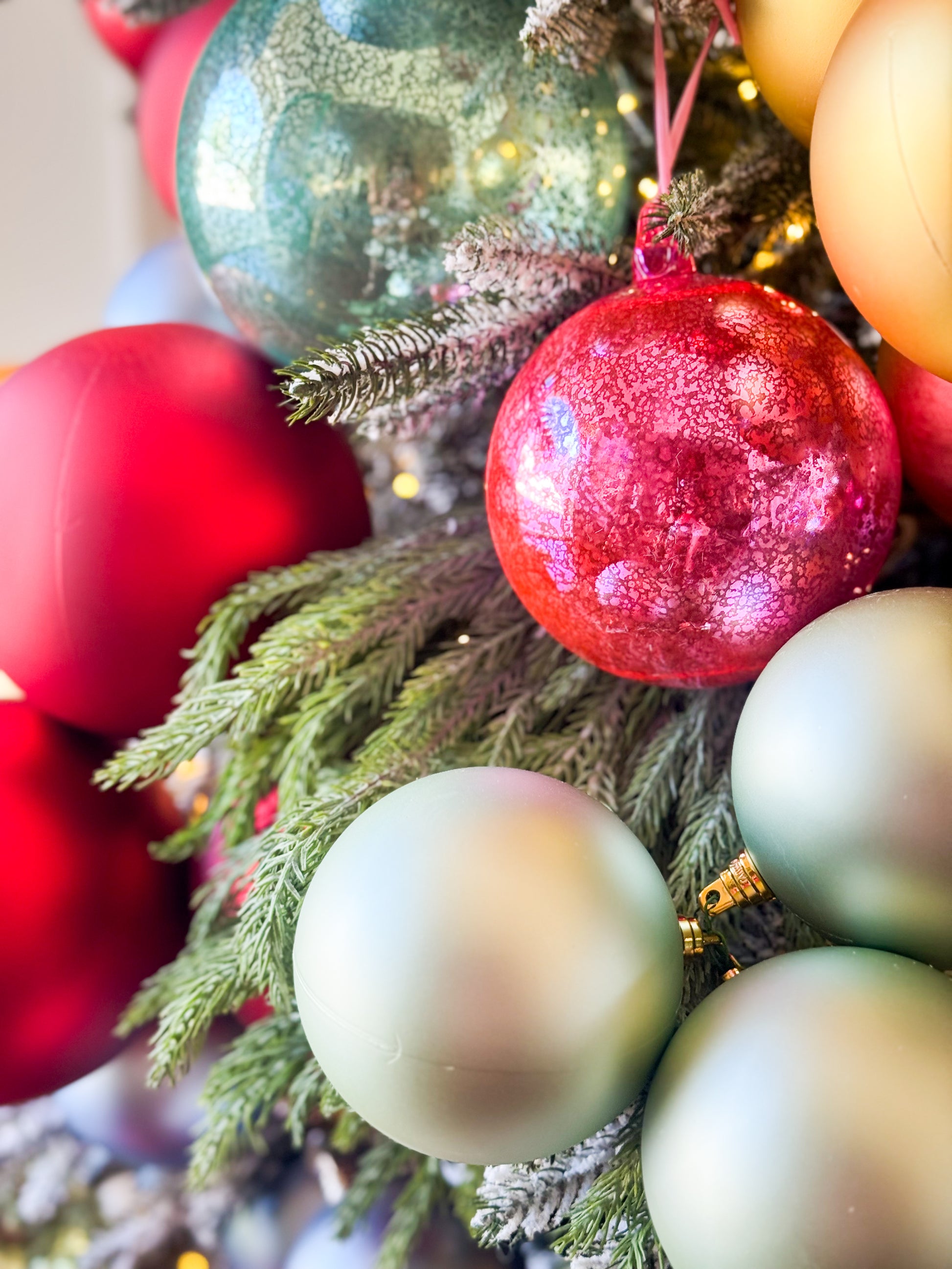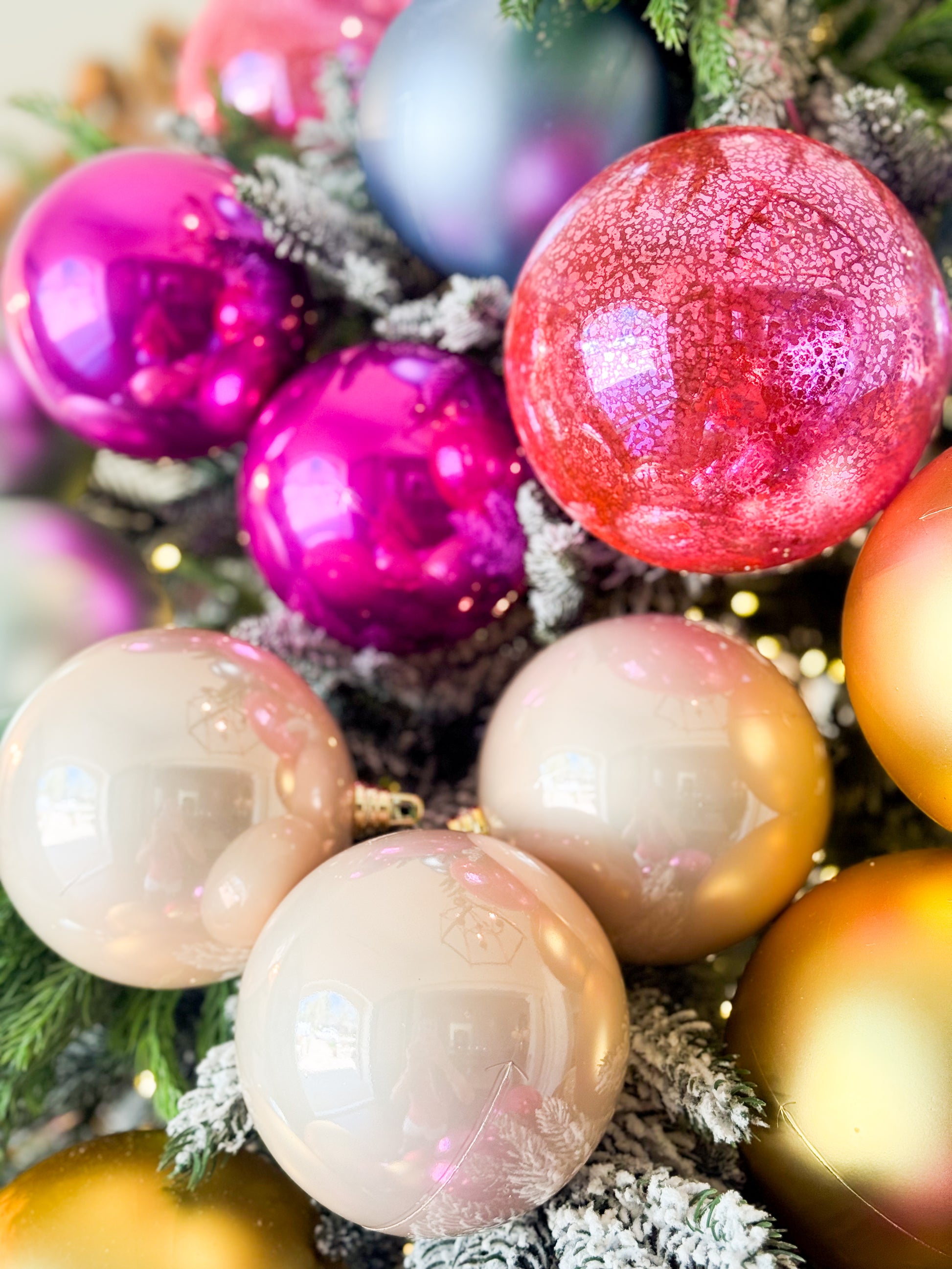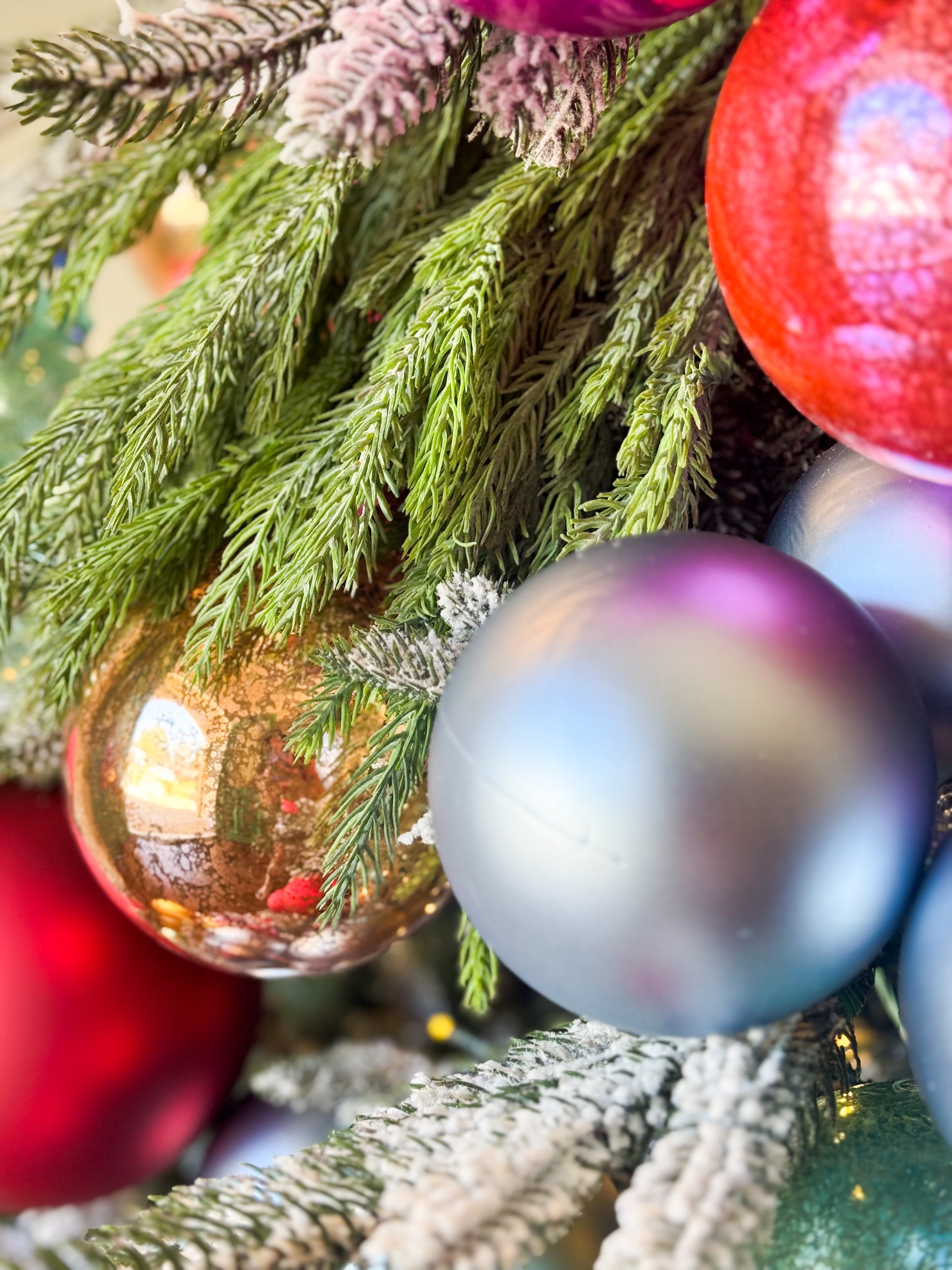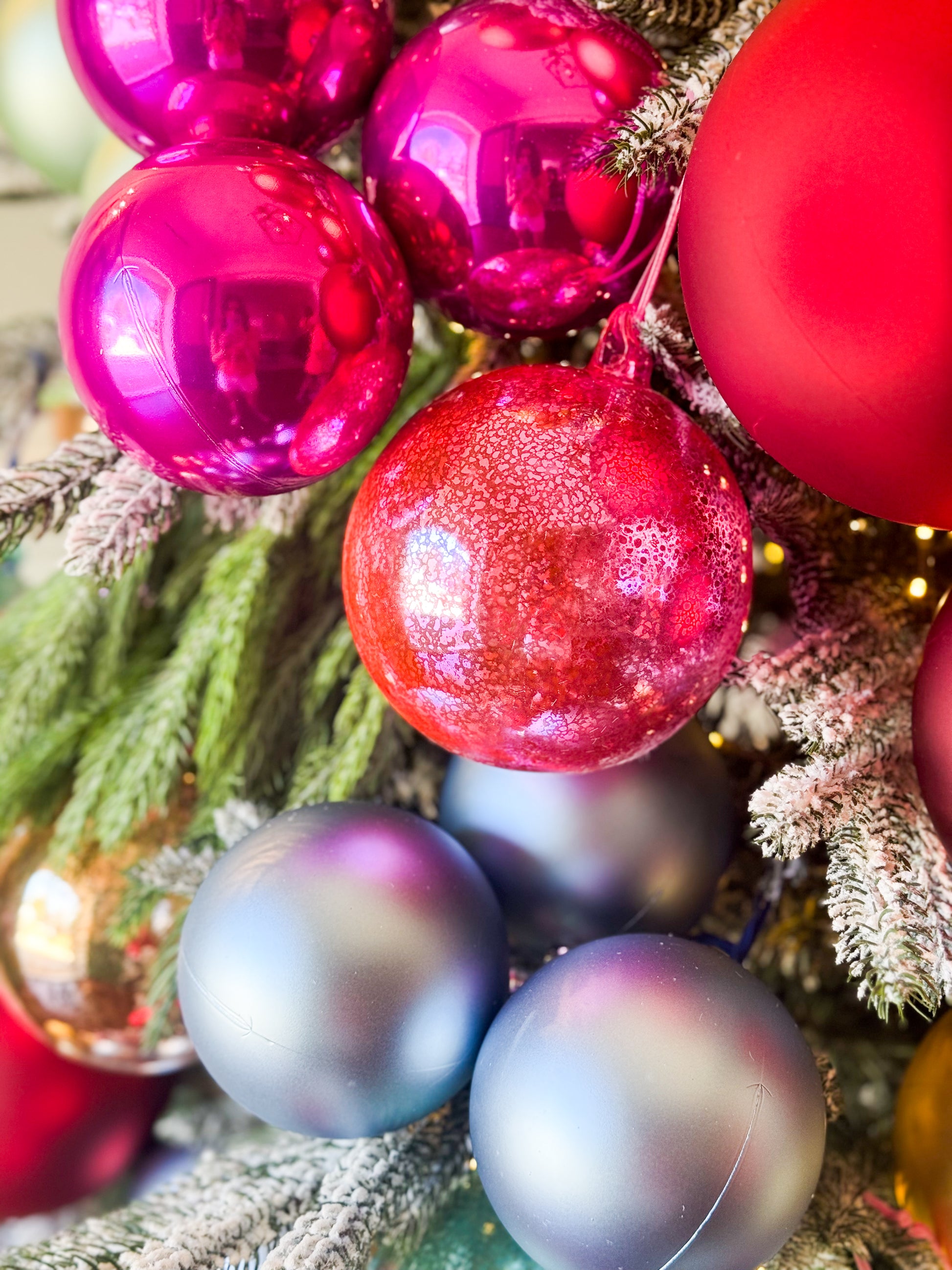 Each box is curated to help you recreate this dazzling, full-bodied design with ease. Layers of oversized ornaments in mixed finishes — glossy, satin, and mercury glass — create a luxurious, high-impact look that’s both joyful and refined. Subtle frosted greenery and warm twinkle lights balance the vibrant tones, transforming your space into a radiant celebration of color and light.