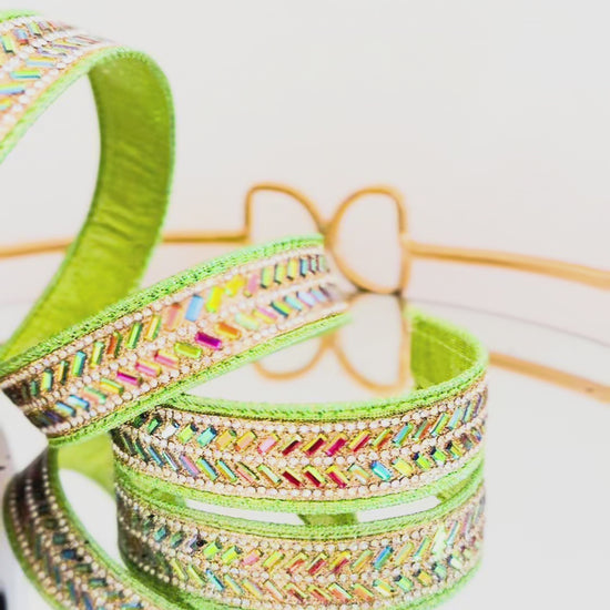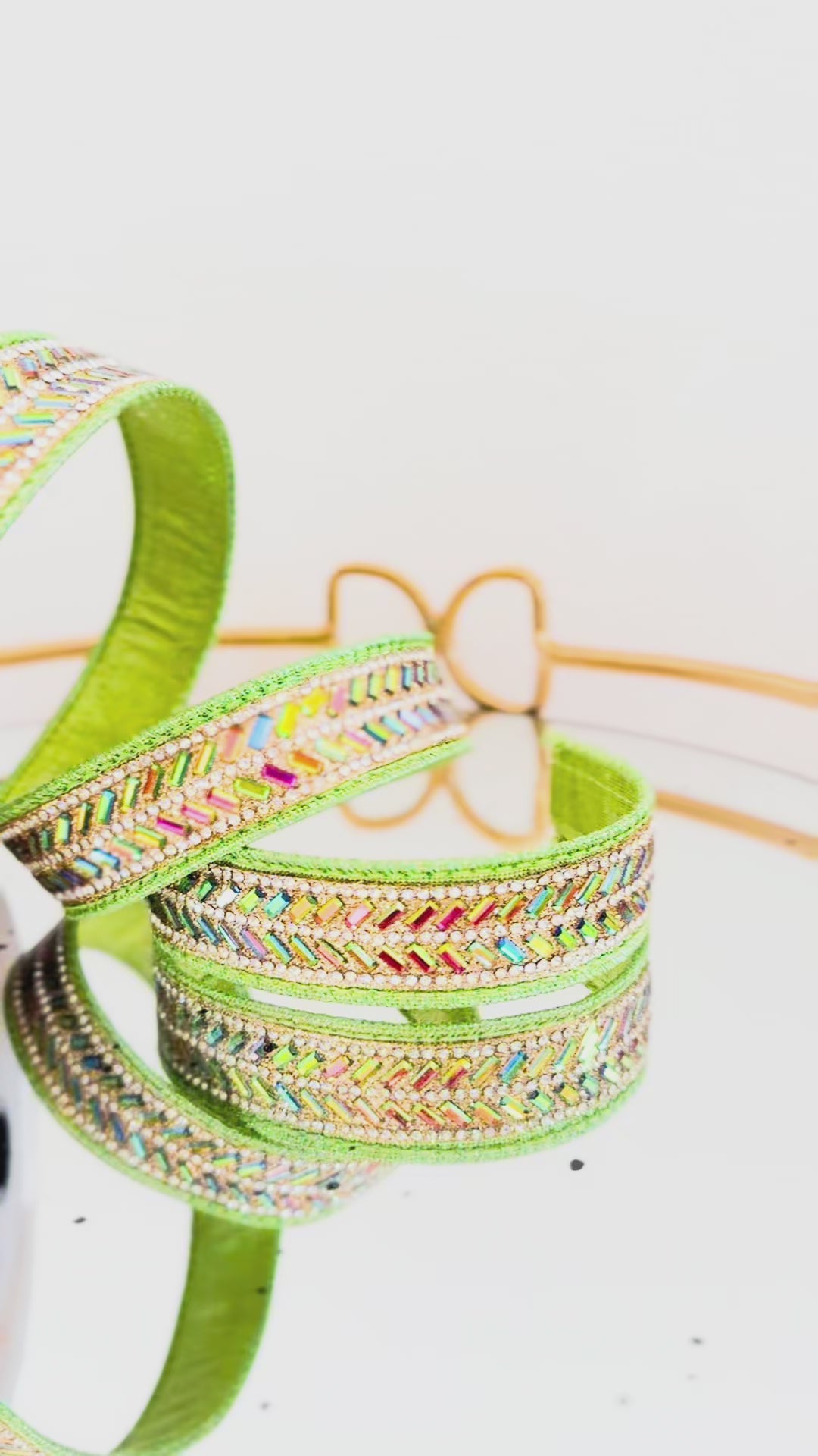 Vibrant, playful, and full of sparkle. The Citrus Jewel Ribbon dances with jewel-tone baguette beading on a fresh chartreuse velvet base. Ideal for Maison de Citron or Fête Noël palettes, it brings a modern, joyful twist to your holiday styling — pair it with citrus ornaments and gold accents for an unforgettable pop.