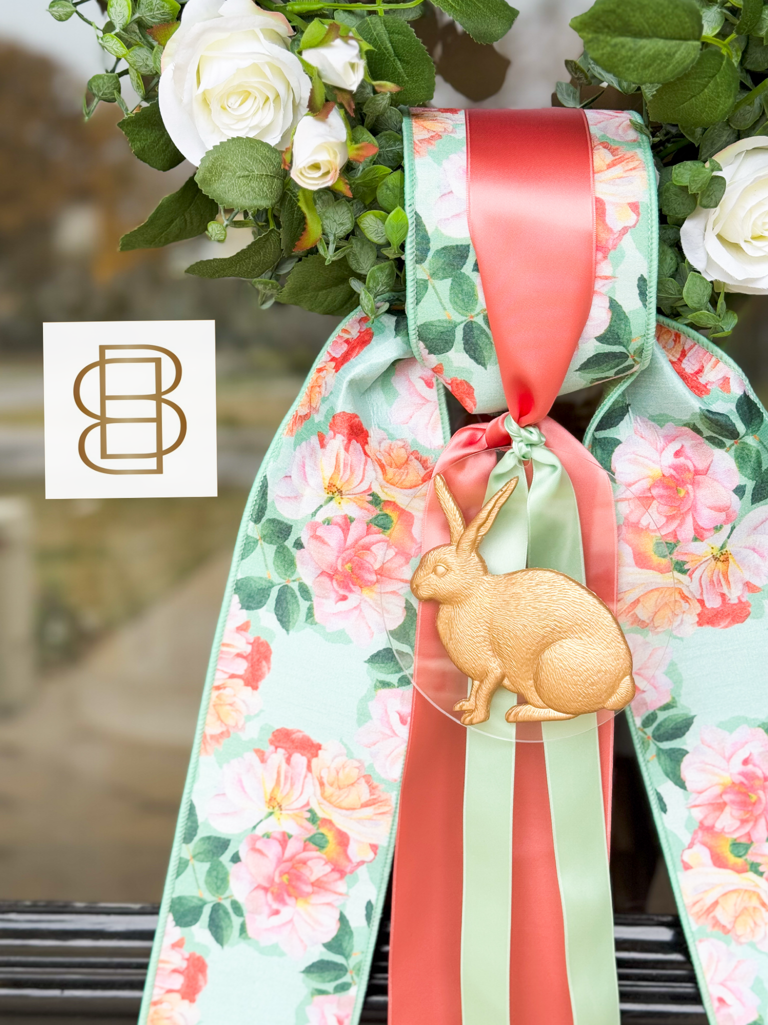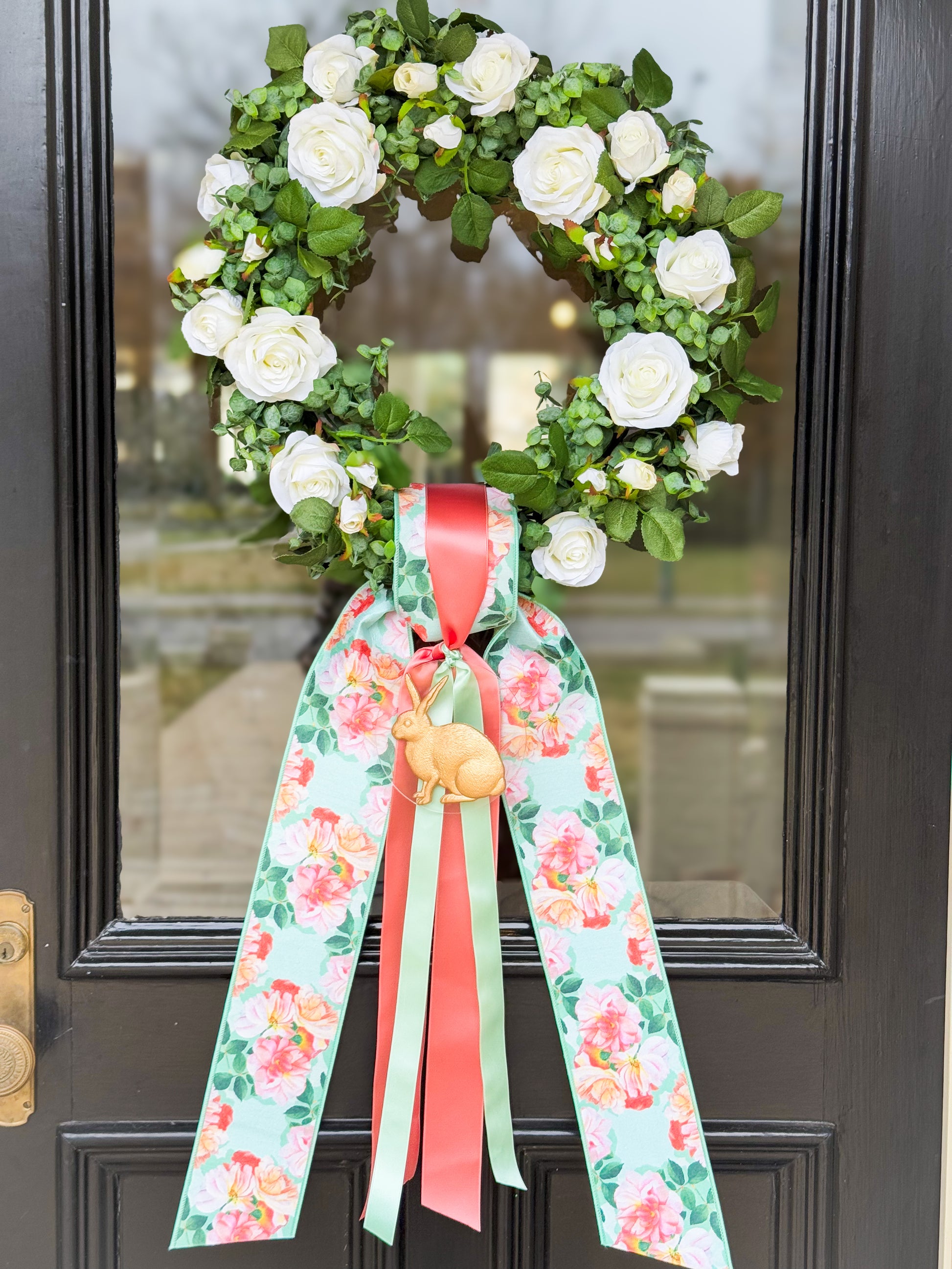 The Cottontail White Rose And Real Touch Eucalyptus Wreath And Layered Vibrant Rose Garden Ribbon Sash With An Oversized Hand Poured Bunny Ornament Will Add An Elegant Pop Of Color Your Front Door Needs This Easter Season With Its Aqua And Coral Designer Floral Ribbon And Luxurious Double Sided Swiss Satins.