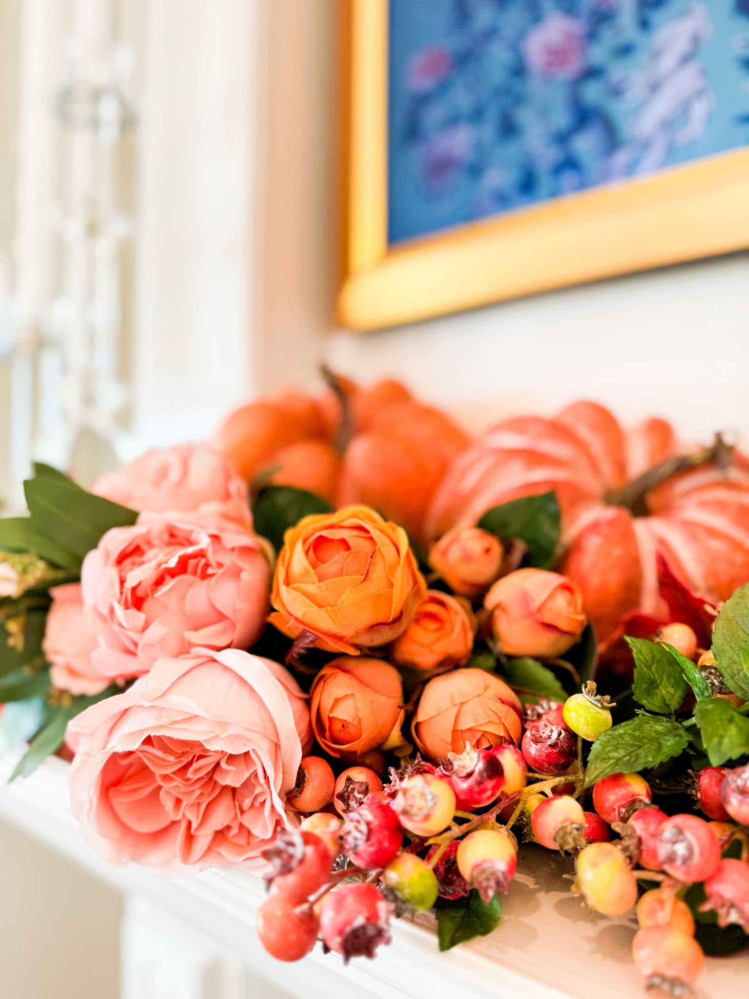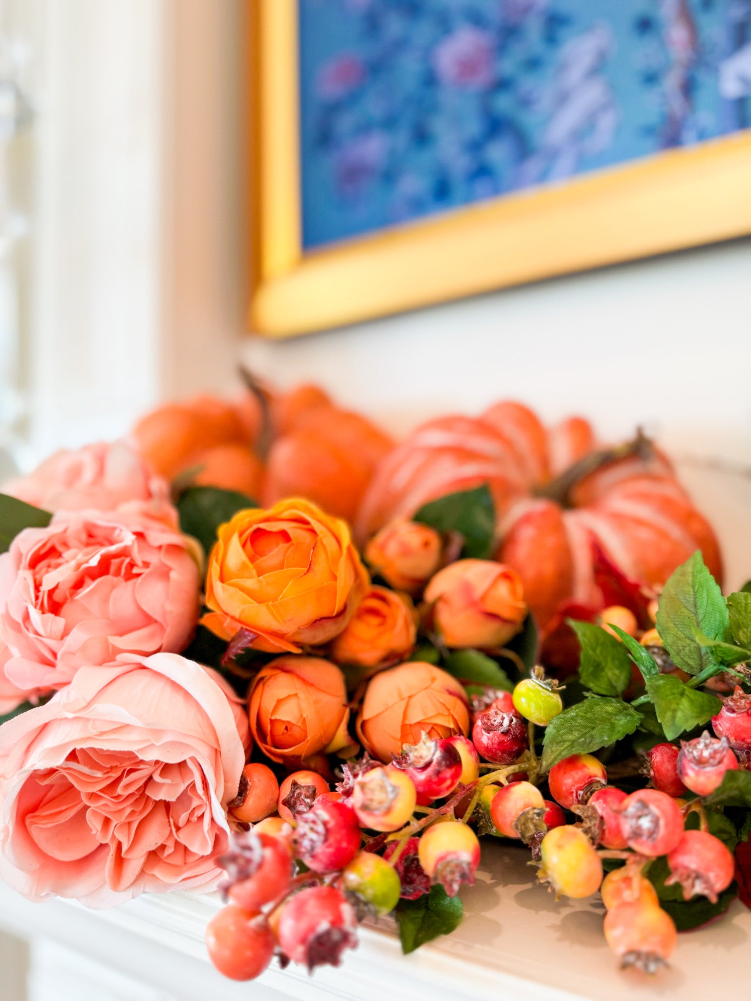 - Faux florals including coral roses and ranunculus for a romantic, full look