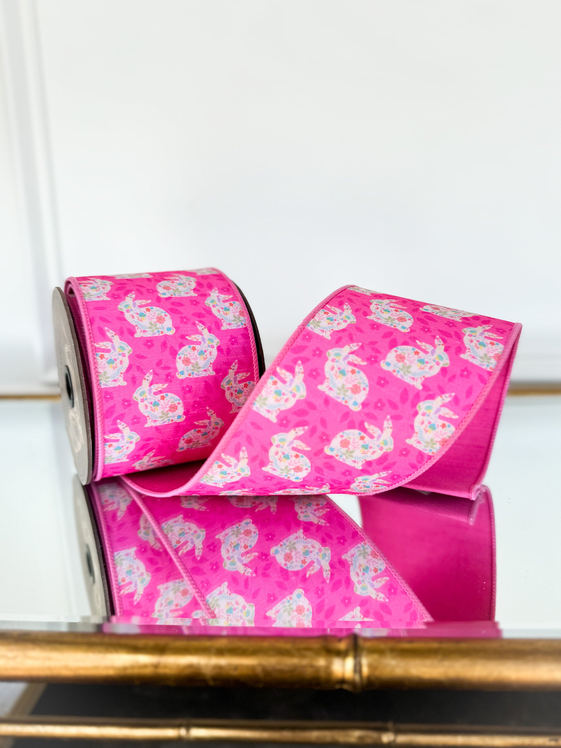 4” x 10 yds Pink Floral Bunny Designer Ribbon, Wired