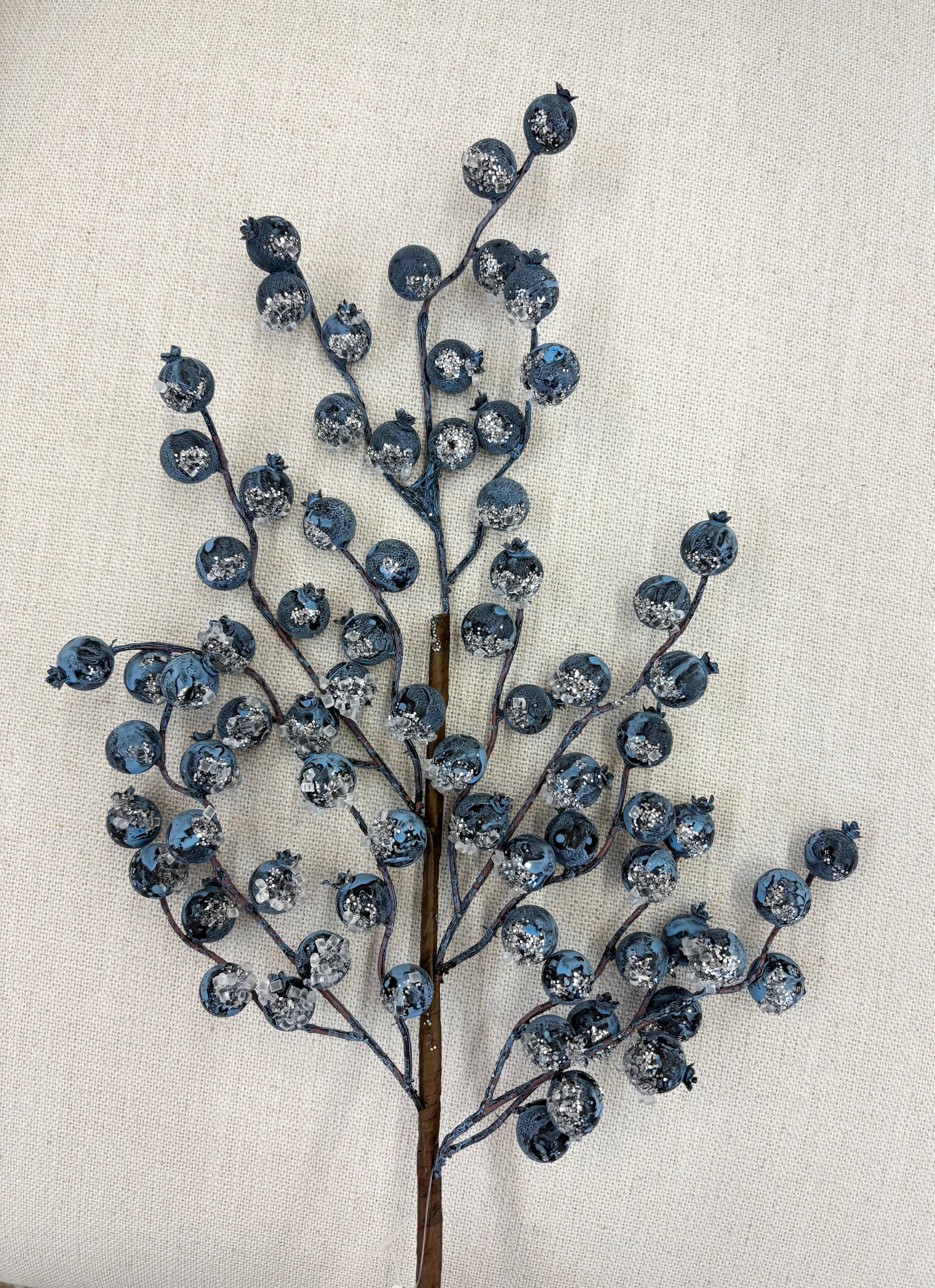 Add elegant texture and dimension to your holiday designs with this stunning Frosted French Blue Berry Spray. Each stem features clusters of deep French blue berries, lightly dusted with frosted glitter accents for a wintry shimmer. The natural brown stem and icy finish pair beautifully with velvet ribbons, gold trims, and blue-and-white ornaments, creating a rich, sophisticated look.