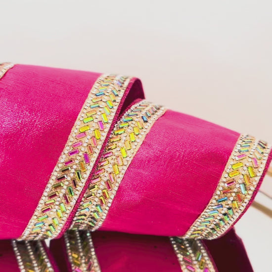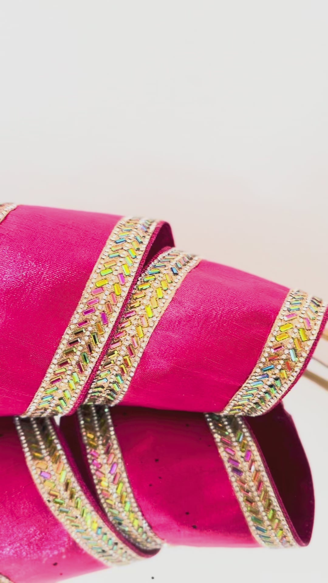 The Fuchsia Bijoux Ribbon blends bold color with bejeweled artistry — a vibrant fuchsia base framed by multicolor crystal herringbone trim. Perfect for Couture Candy Noël or Peachwood Harvest Holiday, it brings high-fashion flair and festive cheer to any décor moment.