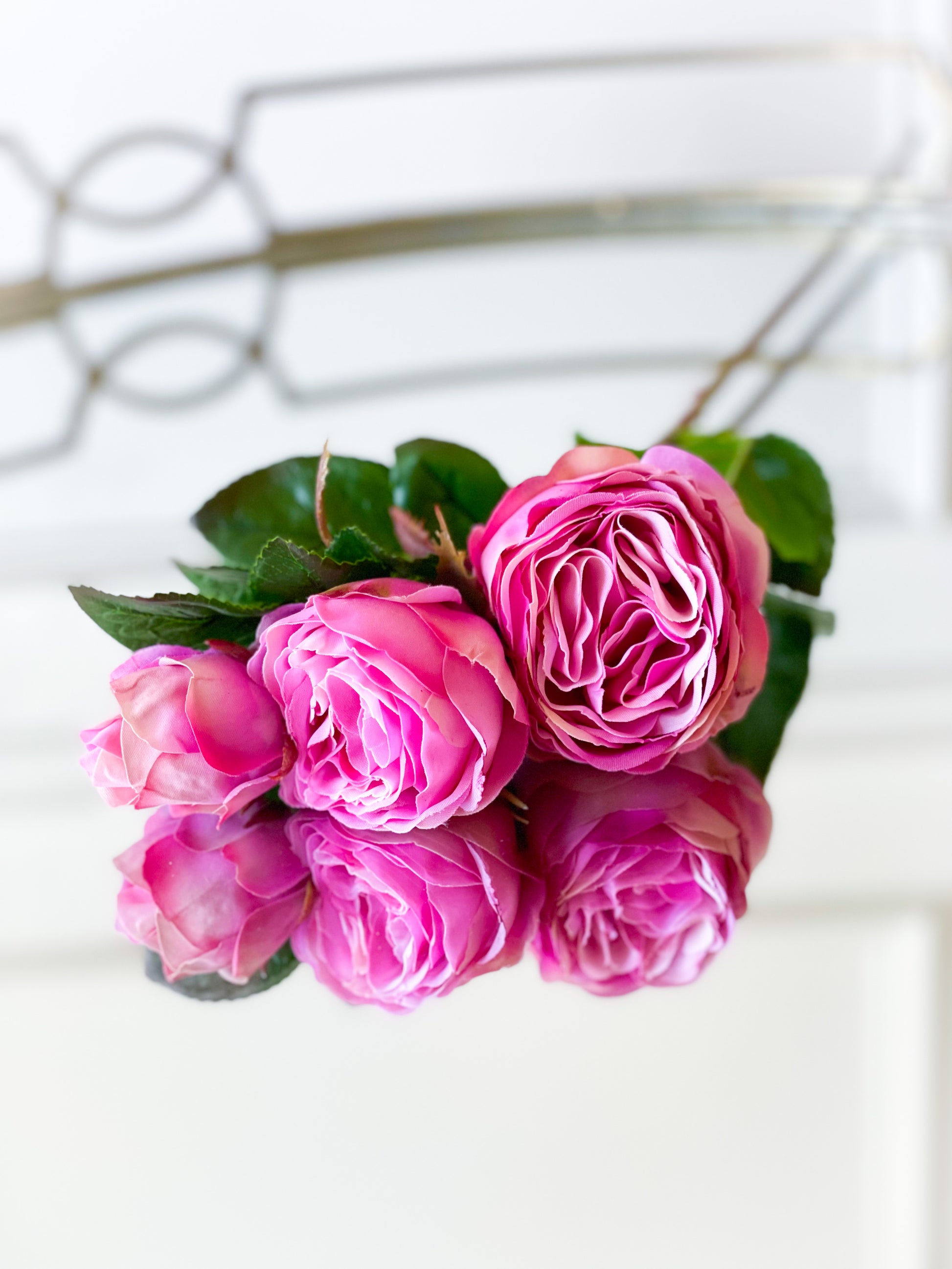 Six 21” Fuchsia Real Touch Cabbage Rose Stems With Three Blooms each.