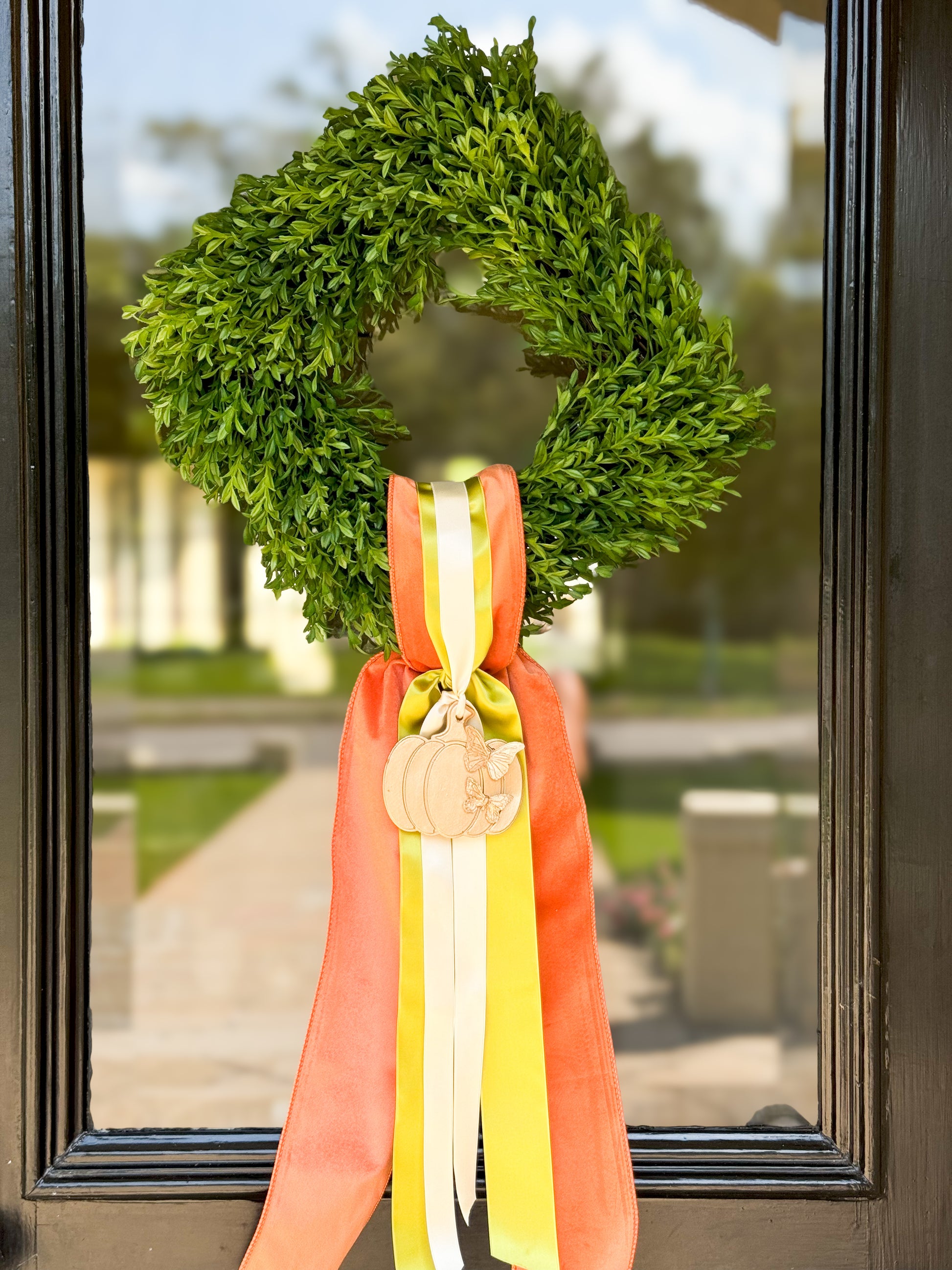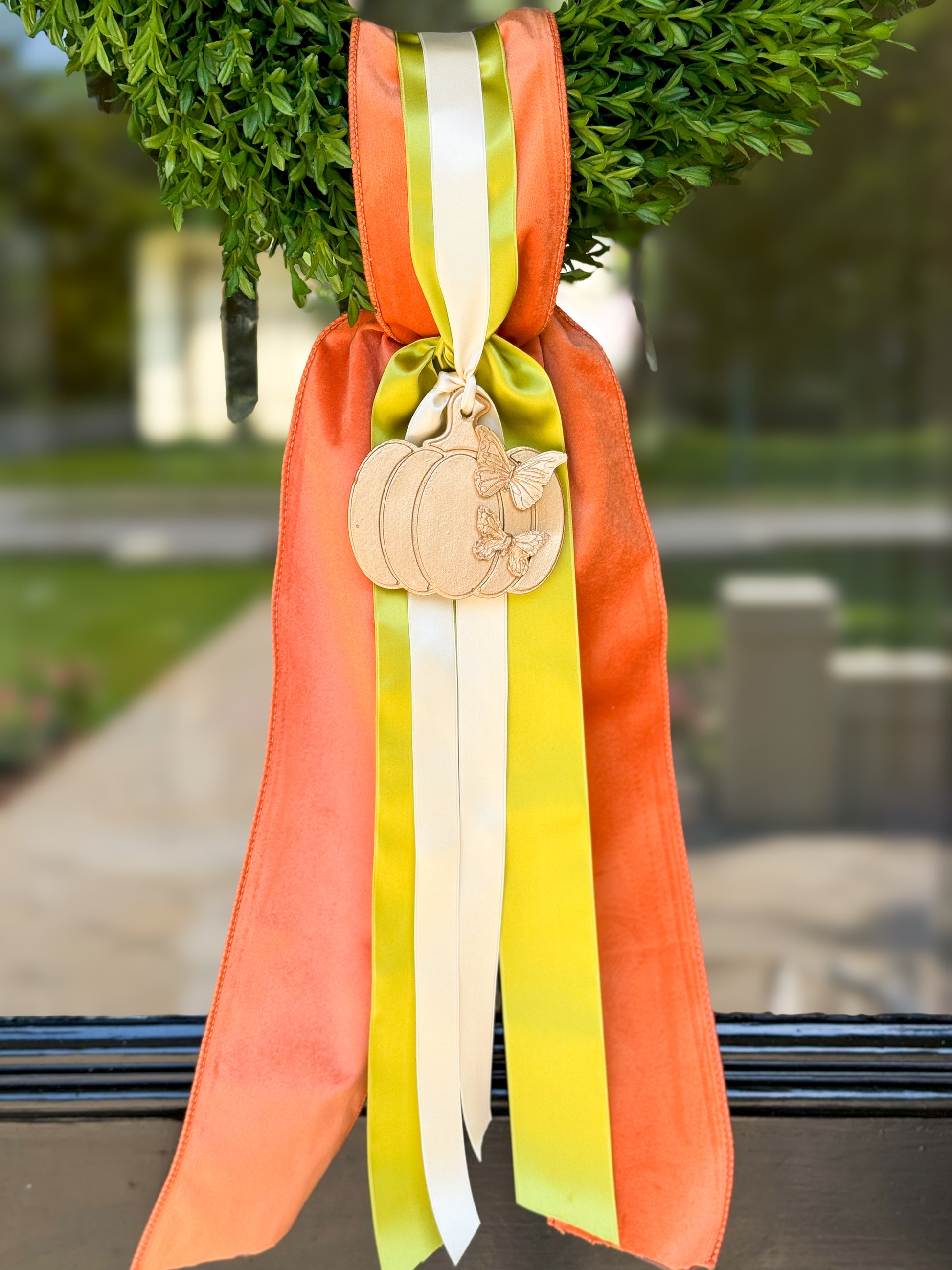 Papillon Pumpkin Tea Leaf Wreath And Layered Ribbon Sash With Handmade Ornament