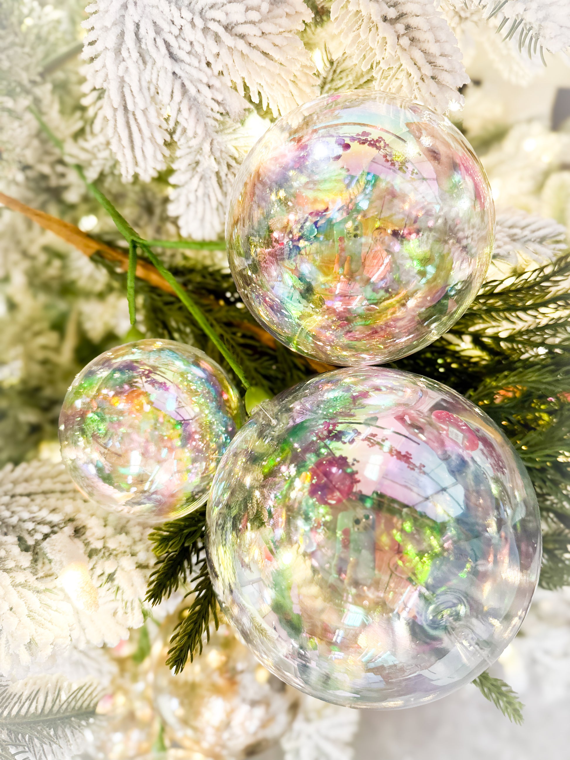 Capture the light and let your tree sparkle with our Iridescent Bubble Trio Pick. Each pick features three airy, hand-crafted spheres with a luminous, rainbow-sheen finish that mimics floating soap bubbles. Effortlessly adds whimsy and dimension to garlands, wreaths, and Christmas trees.