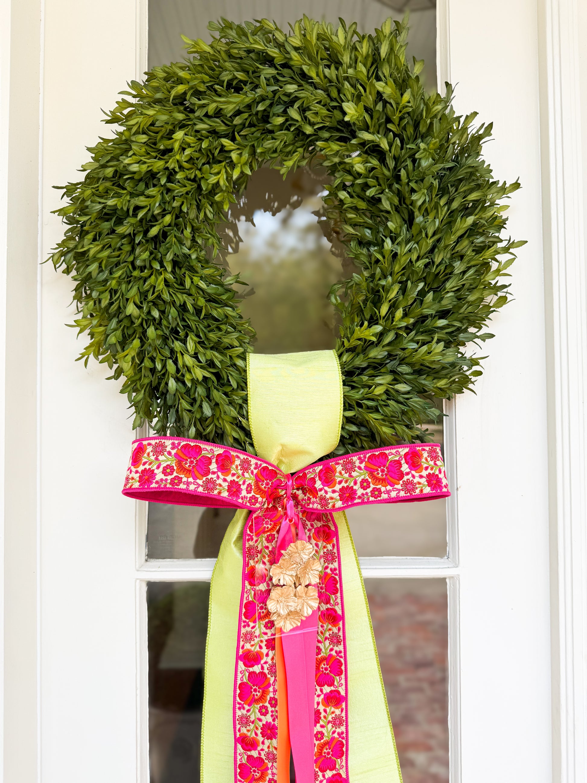 Fresh, vibrant, and effortlessly preppy—our Lime Blossom Garden Tea Leaf Wreath is the ultimate statement for spring and summer doors. Designed on a lush faux tea leaf base, this wreath features rich, lifelike greenery that stays full and beautiful season after season.