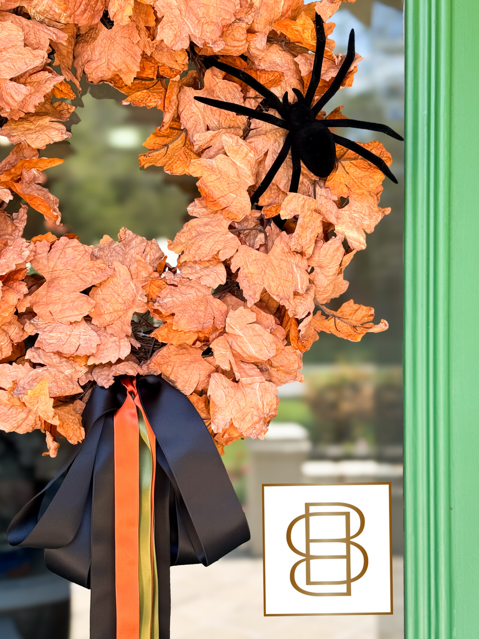 Make a bold, spooky statement this season with the Midnight Creeper Halloween Wreath. Crafted with layers of fiery orange maple leaves, this wreath brings all the warmth of fall with a haunting twist. Perched playfully among the leaves is a velvety black spider, adding just the right amount of eerie charm for your front door.