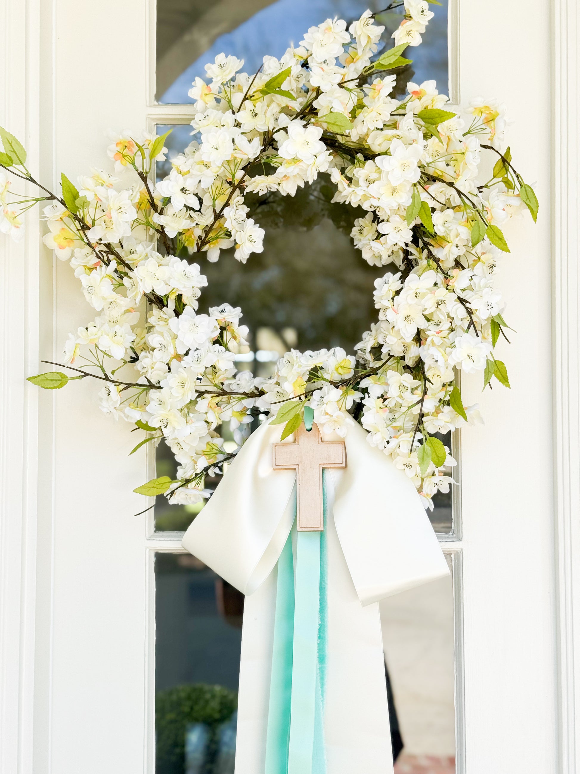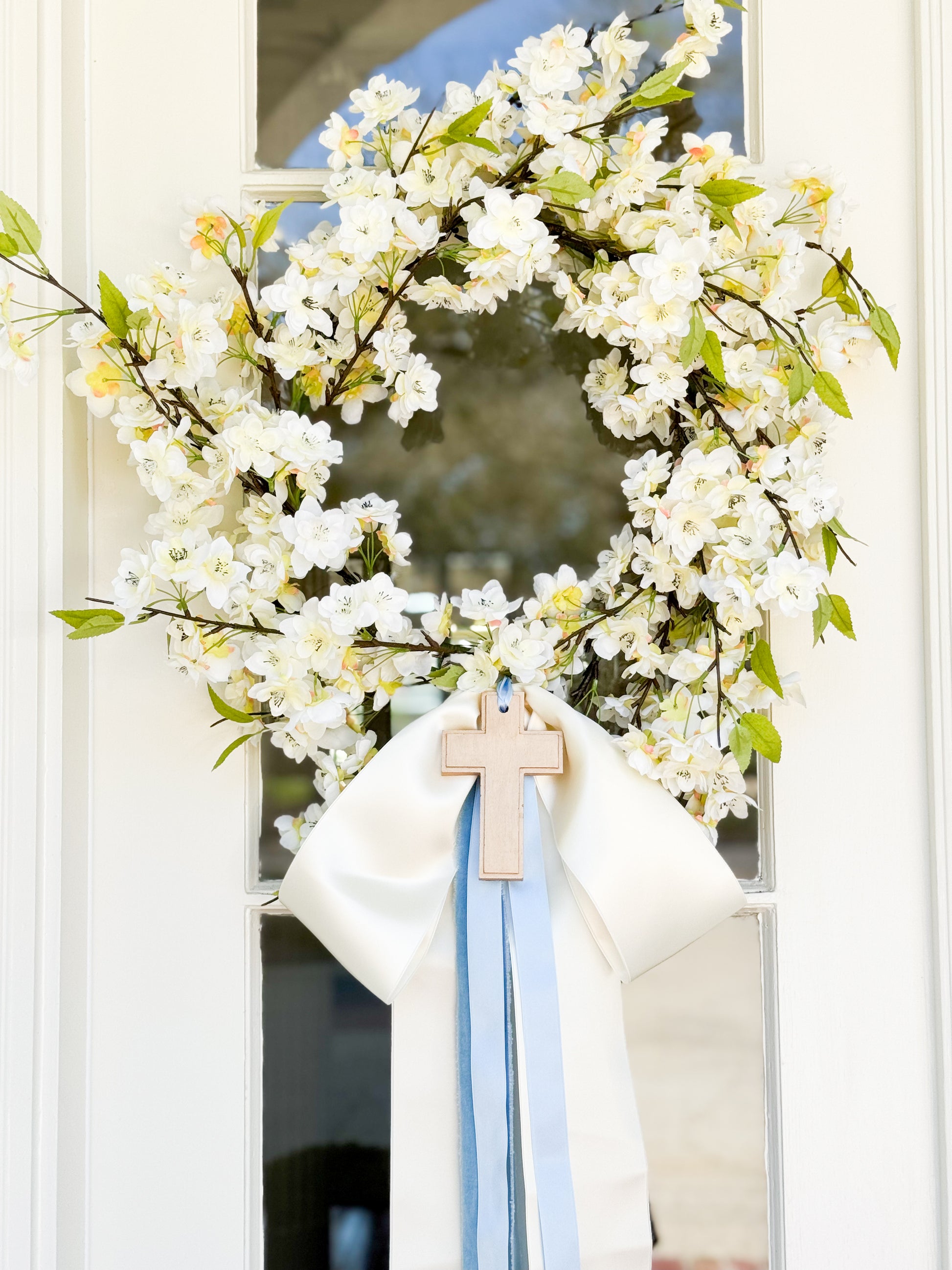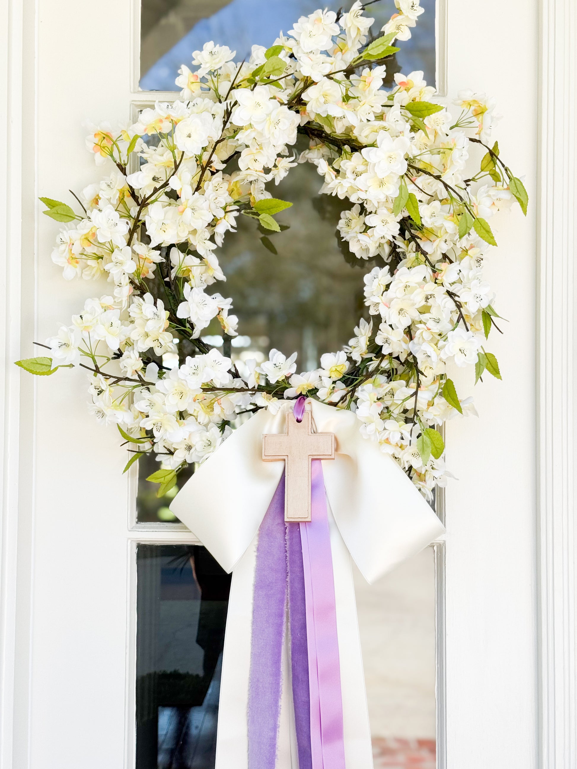 The New Life White Cherry Blossom Wreath Is Available In Four Color Options: Pink, Blue, Aqua And Purple. This Beautiful Design Will Bring New Life To Your Home And Remind’s Us This Holy Season Of God’s Promise For Us.