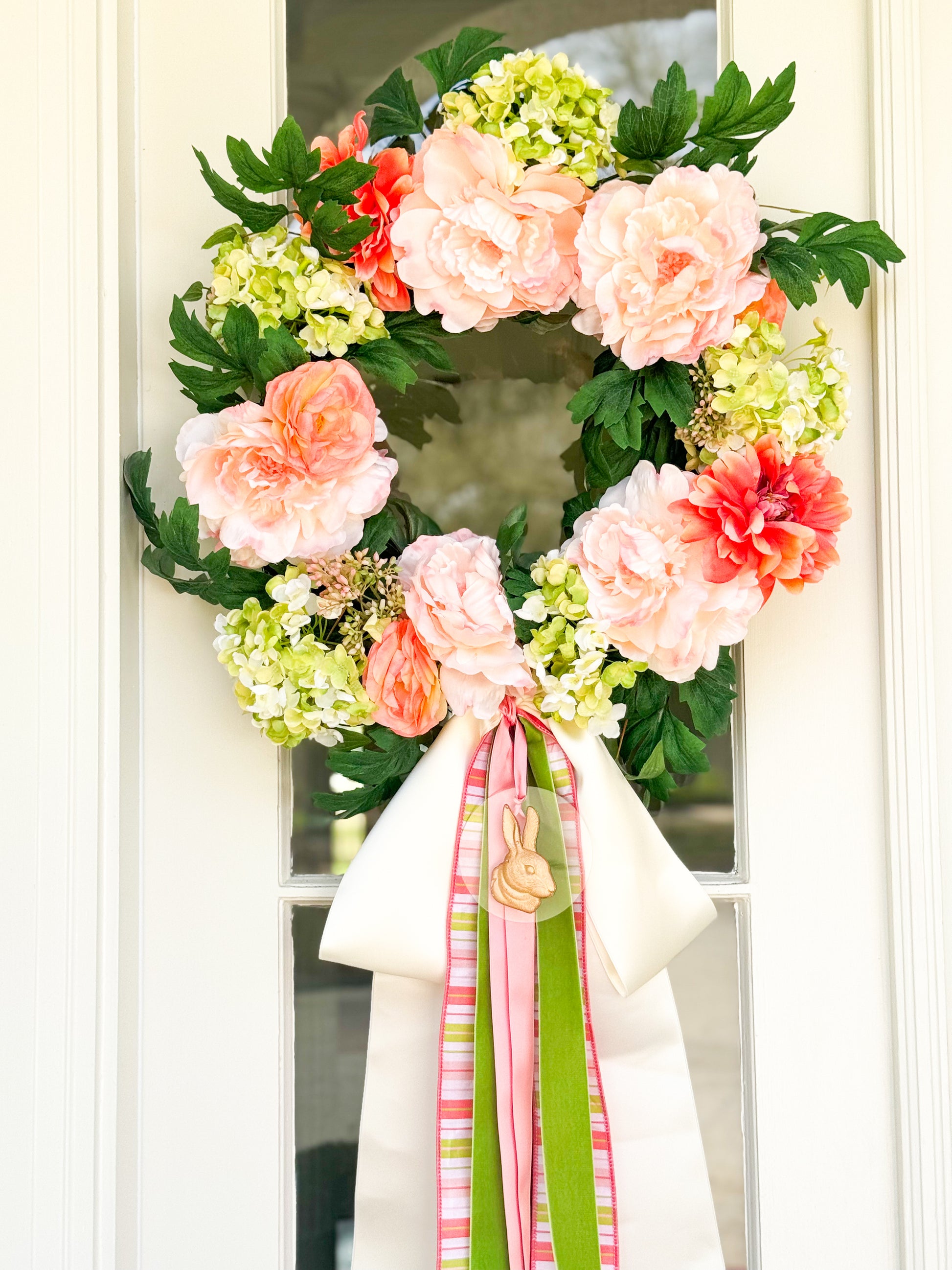 The Peachy Peony Cottontail Wreath With A Beautifully Layered Spring Bow With Handcrafted Bunny Ornament Includes Lovely Florals And Designer Ribbon To Create The Perfect Spring Look For Your Home.