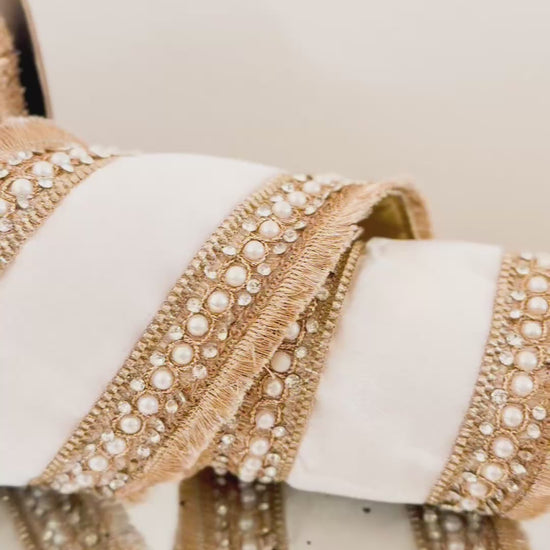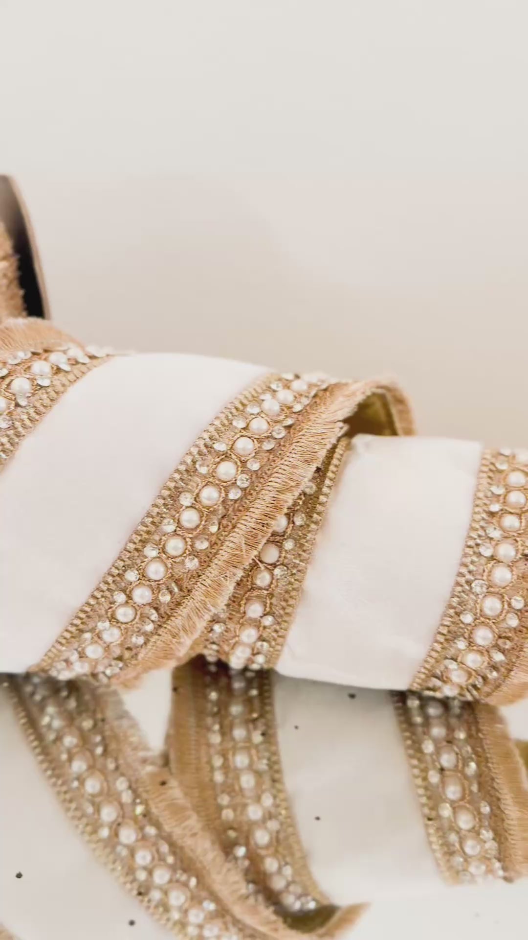 Understated elegance meets French refinement. The Pearl Chateau Ribbon showcases soft ivory velvet bordered with delicate pearls and crystal detailing, finished in brushed gold threading. Ideal for Fleur Noël or Versailles Noël, it evokes the sophistication of Parisian winter interiors.