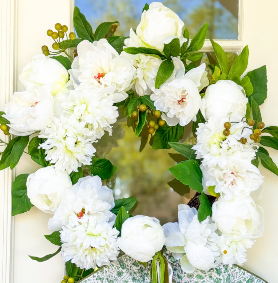 The 26” White Perfectly Peony Easter Wreath With A Layered Bow Along With A Handcrafted Bunny Ornament.