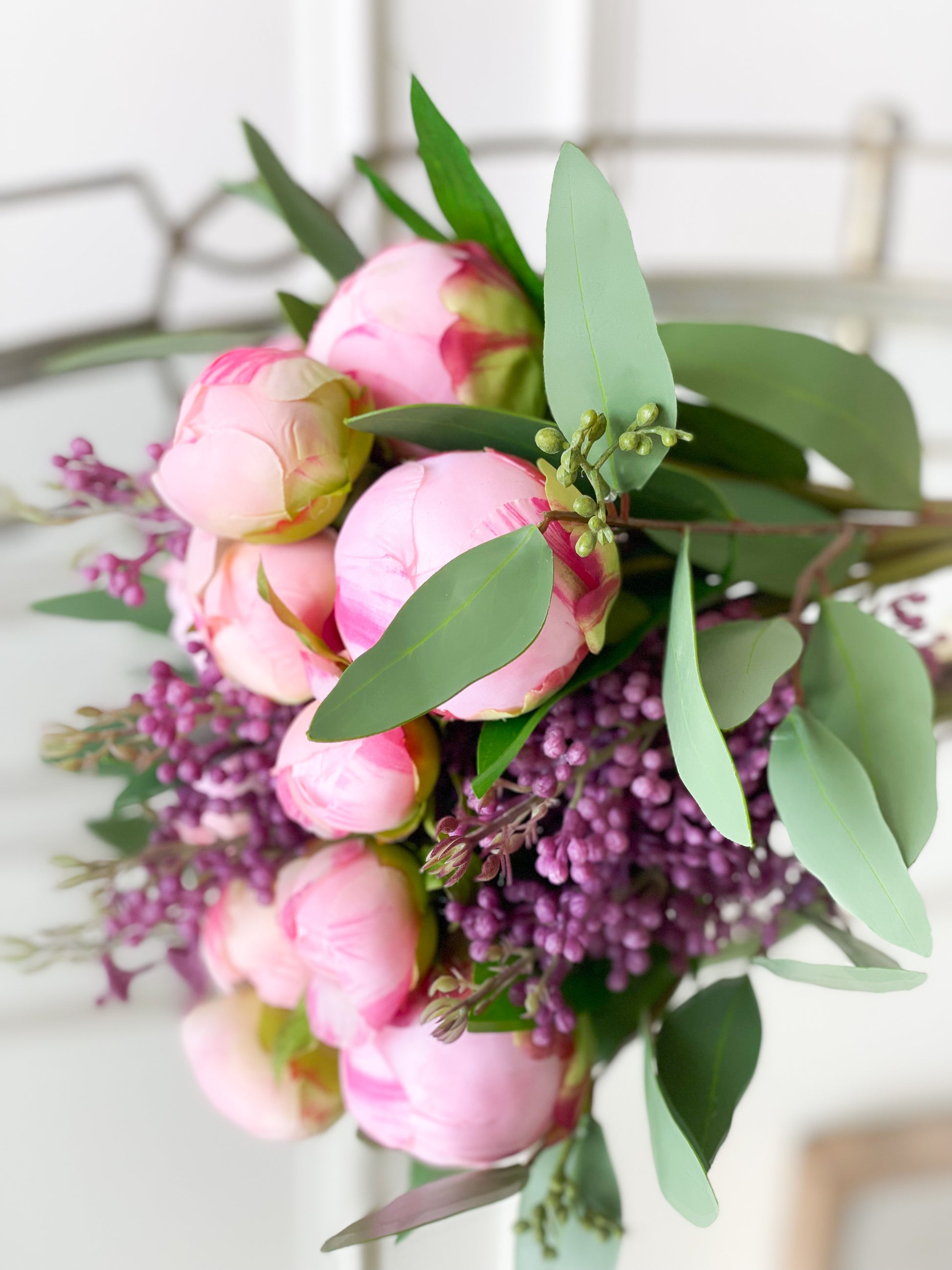 14” Silk Pink Peony Bud, Lilac, And Real Touch Eucalyptus Bouquet With Satin Bow