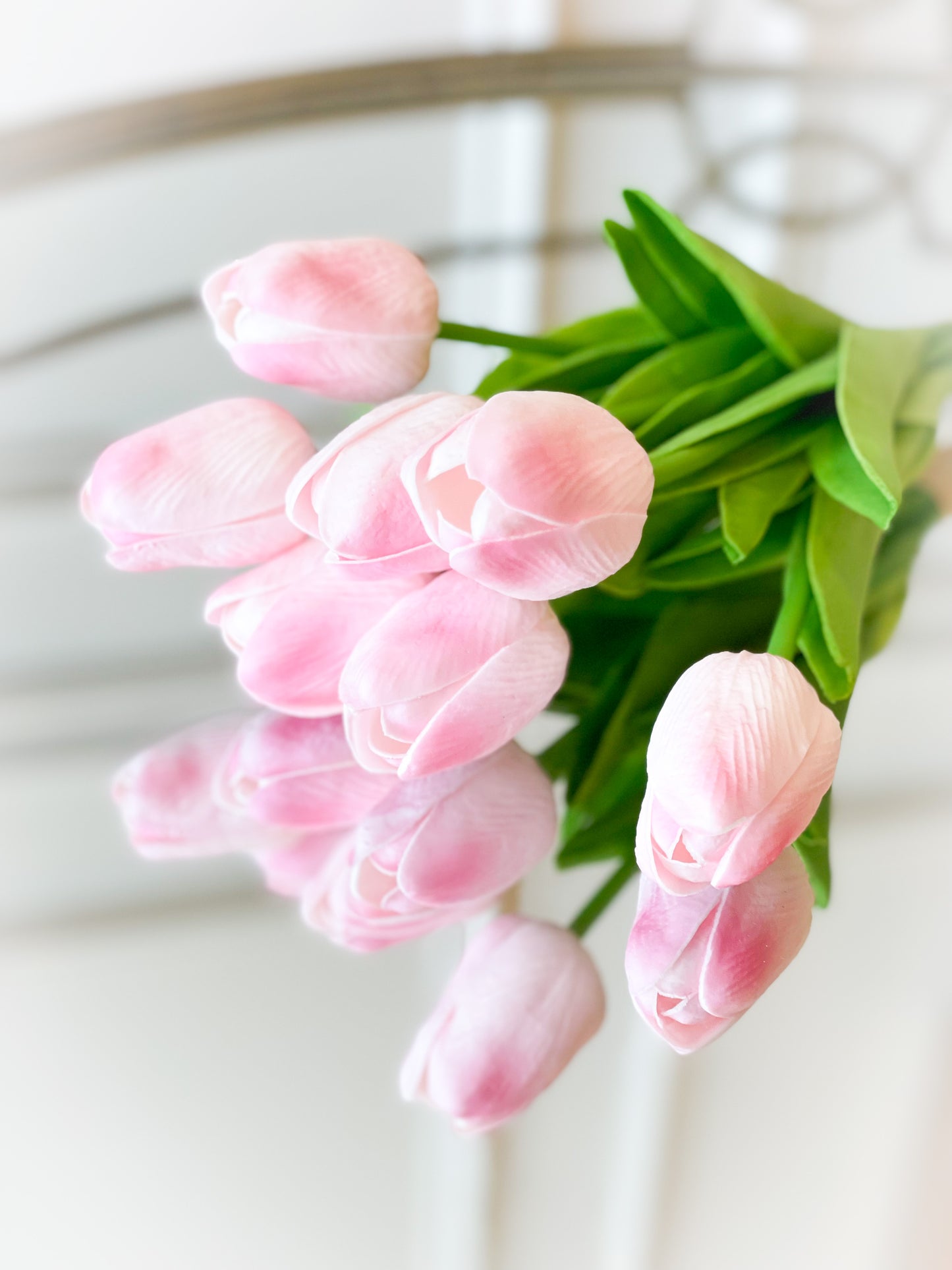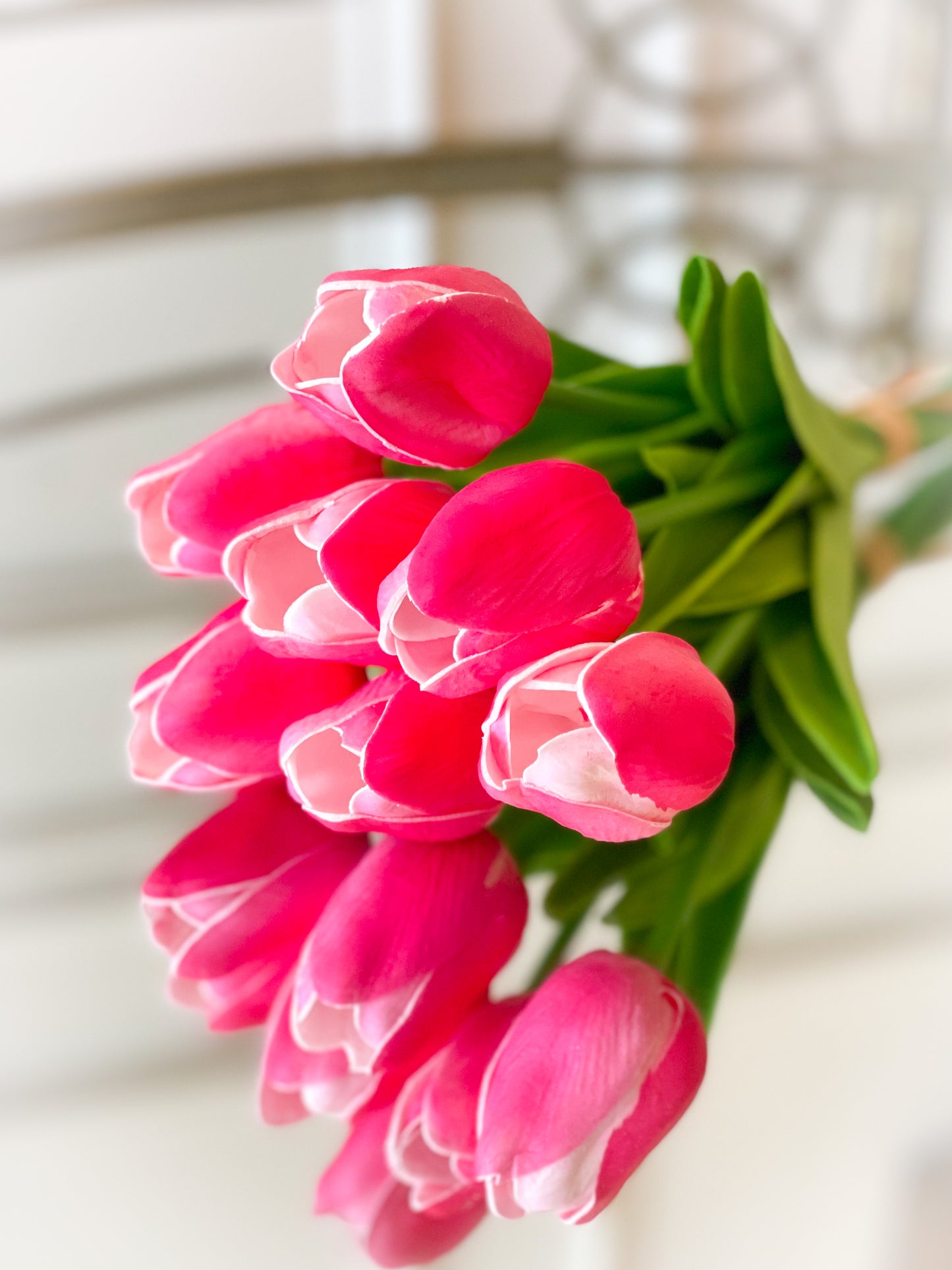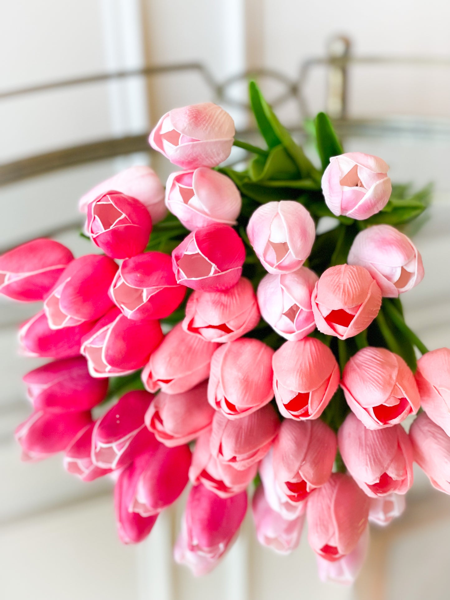 The Pippa Tulip Trio Bouquet Includes 7 bubble gum pink Real Touch Tulips, 7 Soft Pink Real Touch Tulips, 7 Hot Pink Real Touch Tulips.