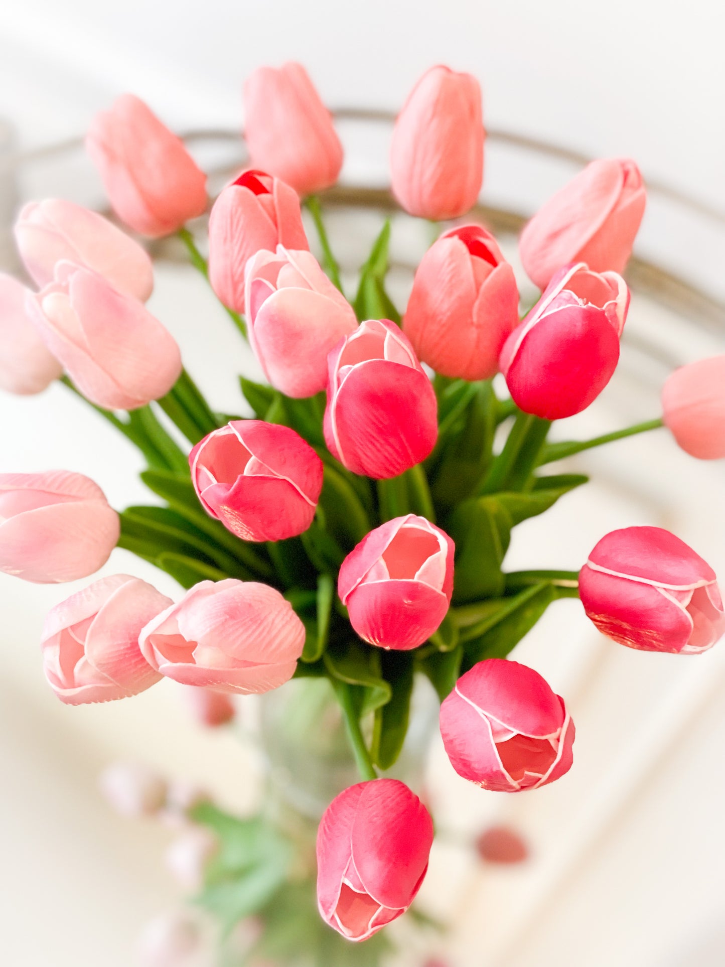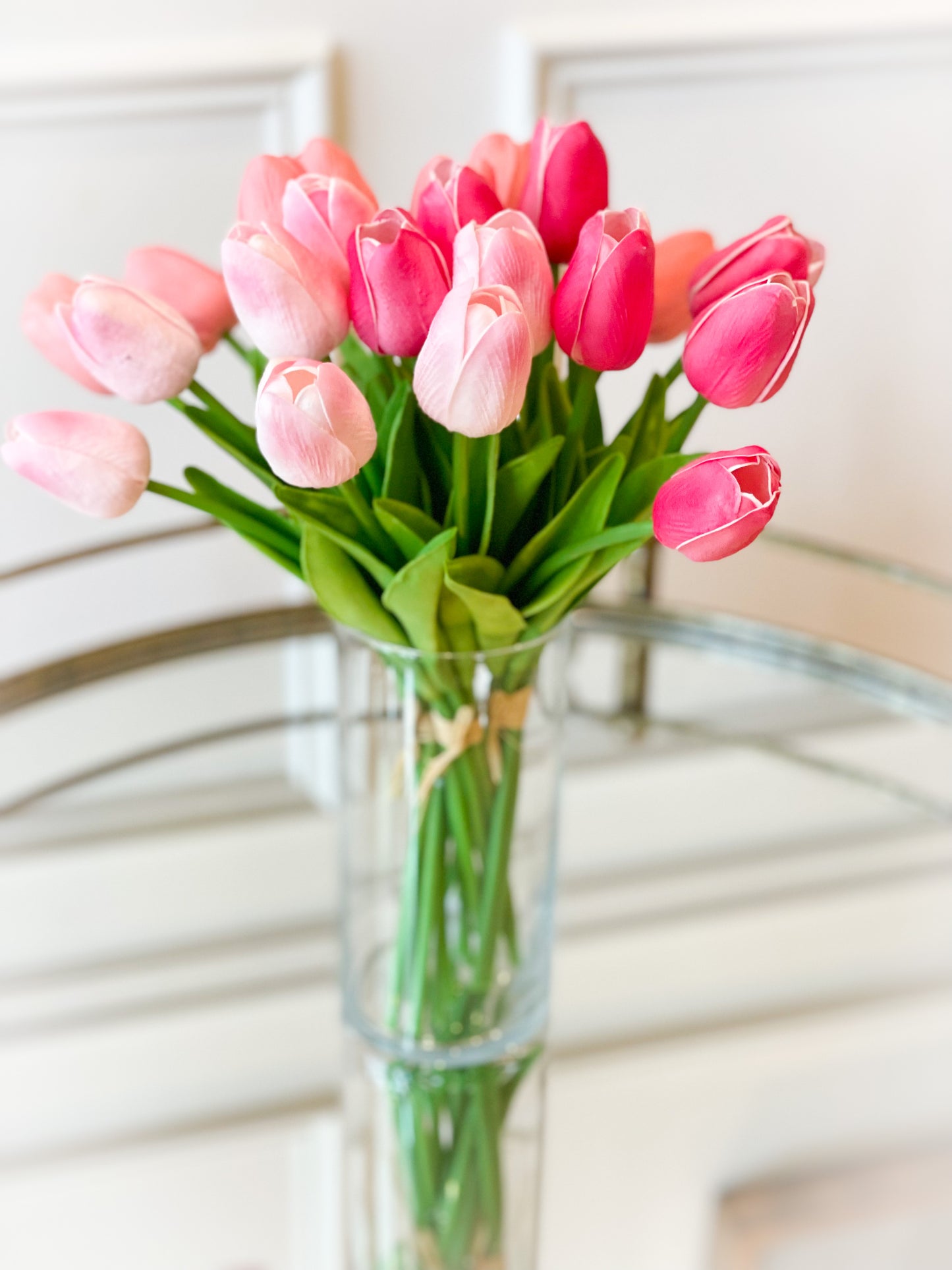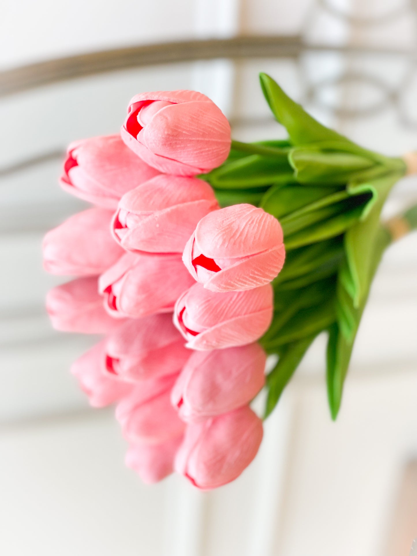 The Pippa Tulip Trio Bouquet Includes 7 bubble gum pink Real Touch Tulips, 7 Soft Pink Real Touch Tulips, 7 Hot Pink Real Touch Tulips.
