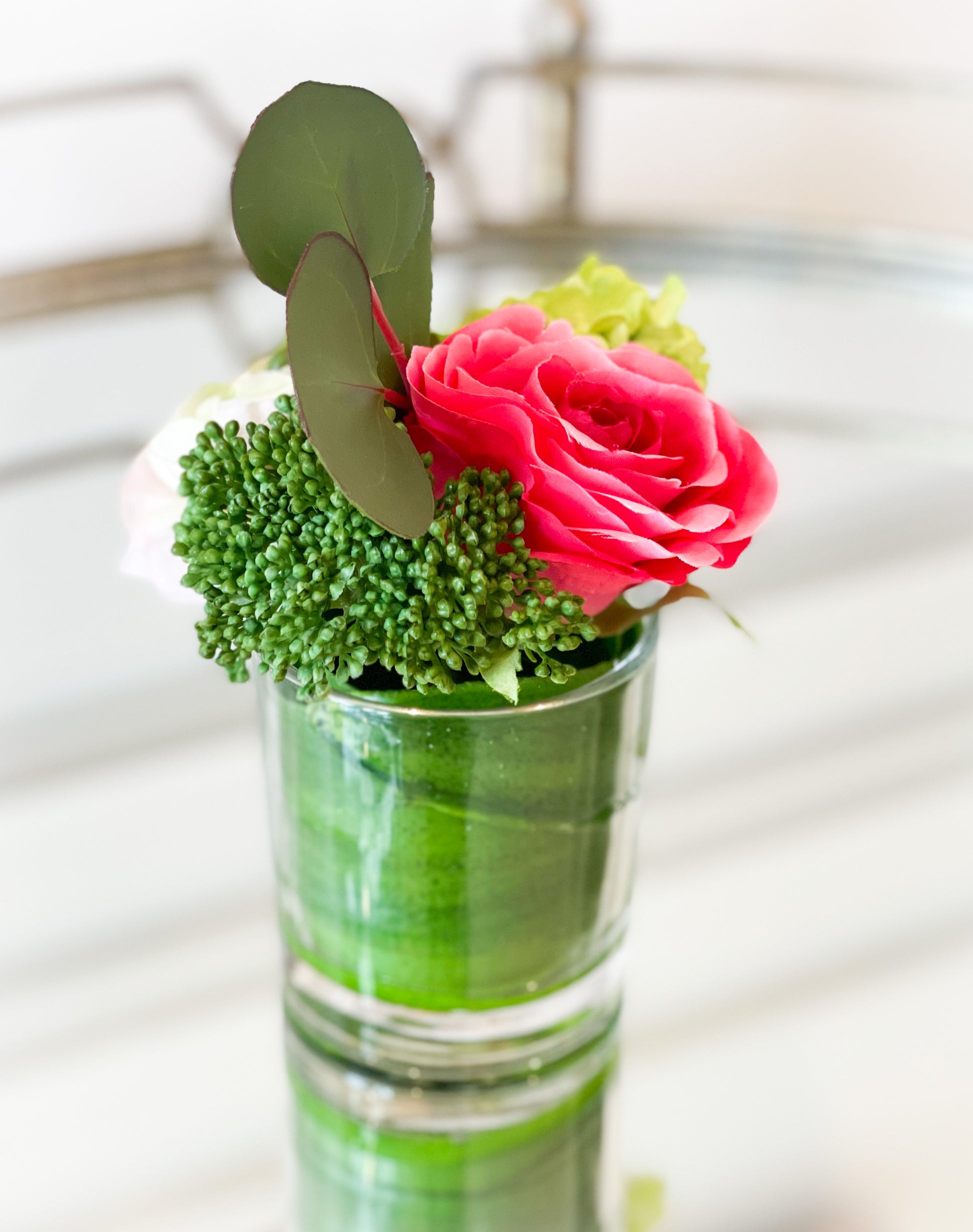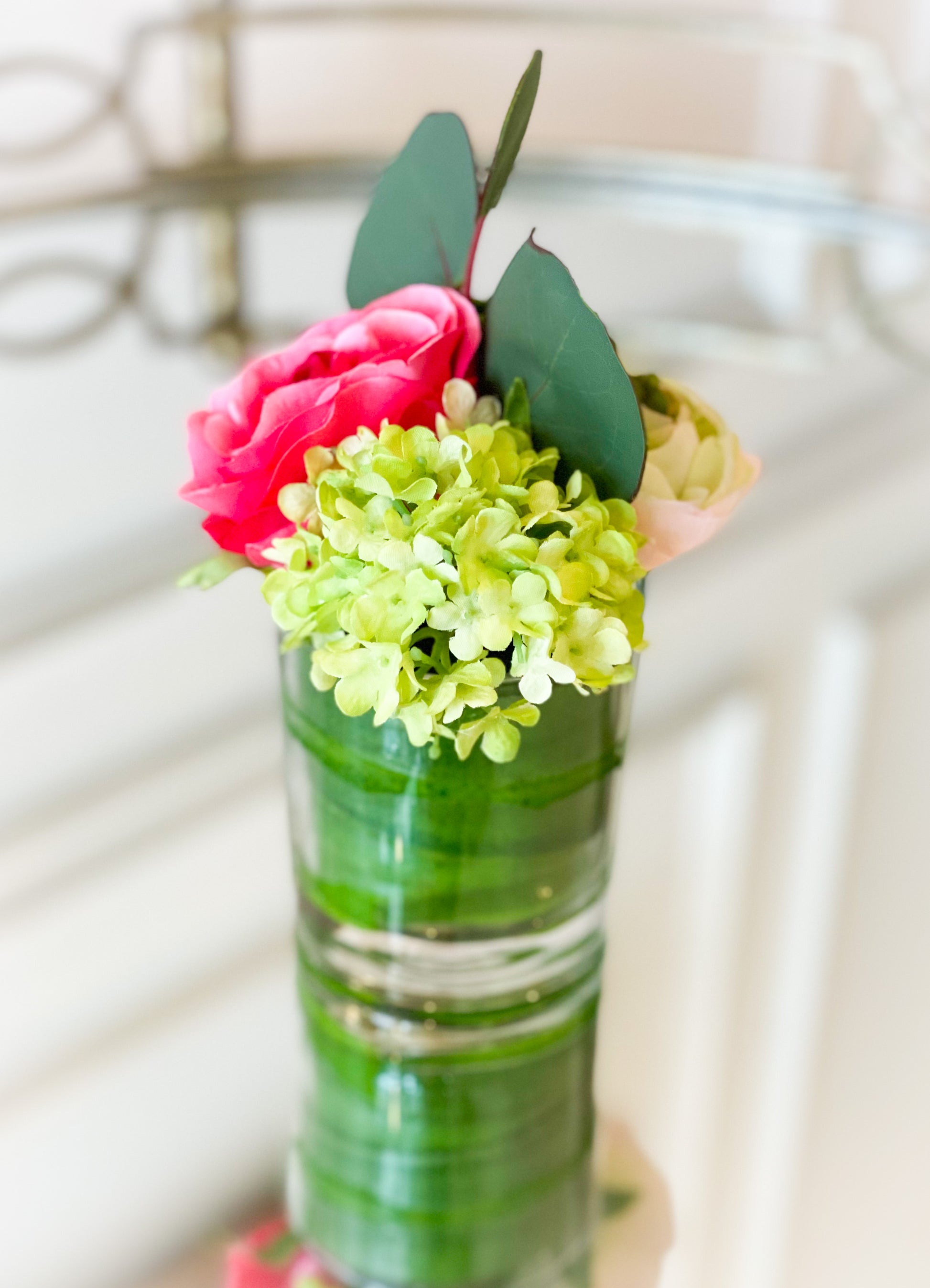 5.25” Ranunculus, Rose, And Snowball In A Glass Vase