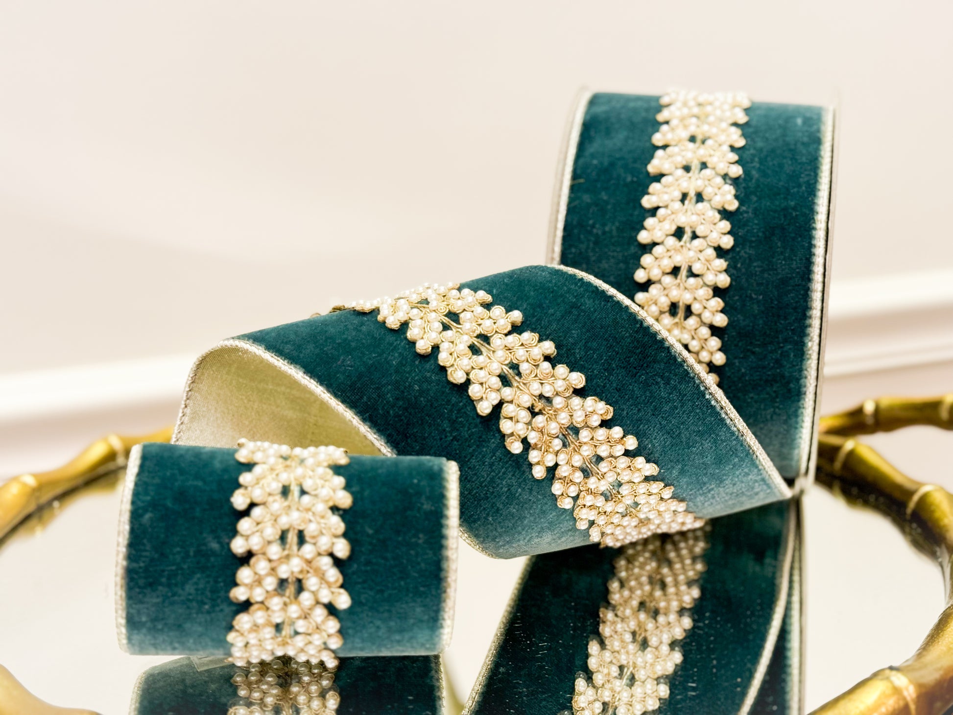 4”x5yd Celadon Royal Pearl Vine Velvet Ribbon, Wired