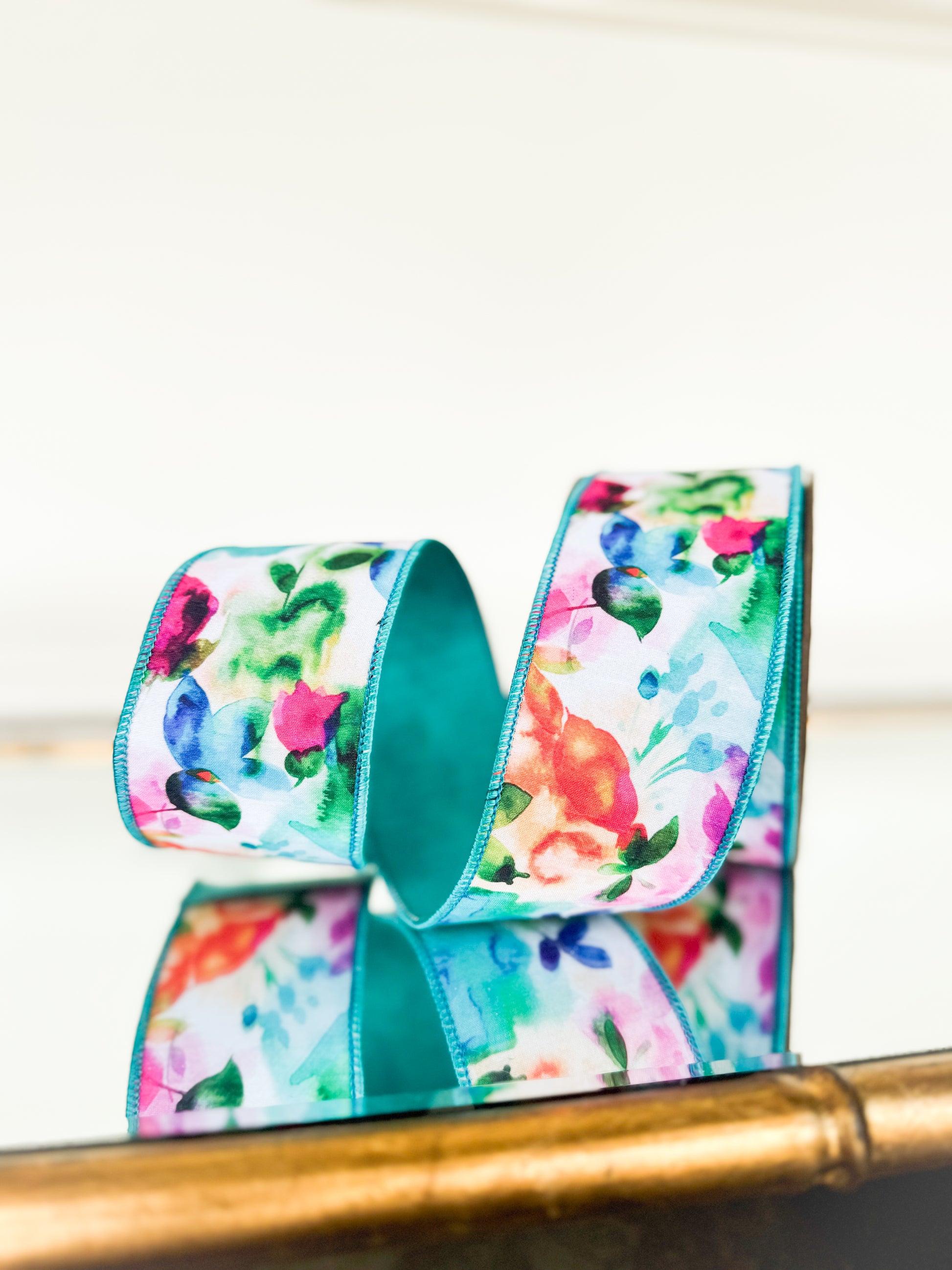2.5” x 10 yds Watercolor Floral Bouquet Designer Ribbon, Wired