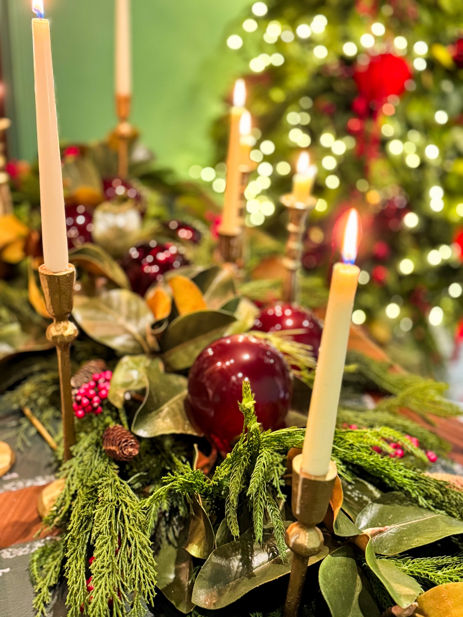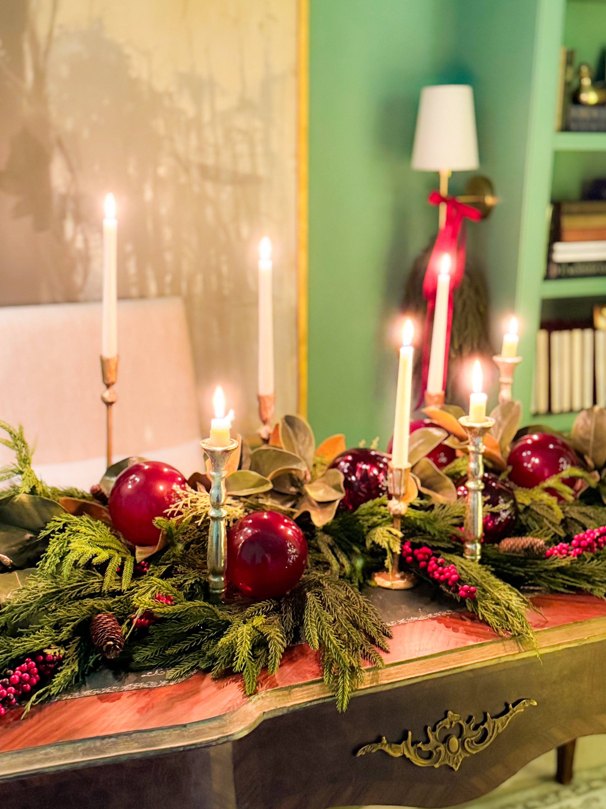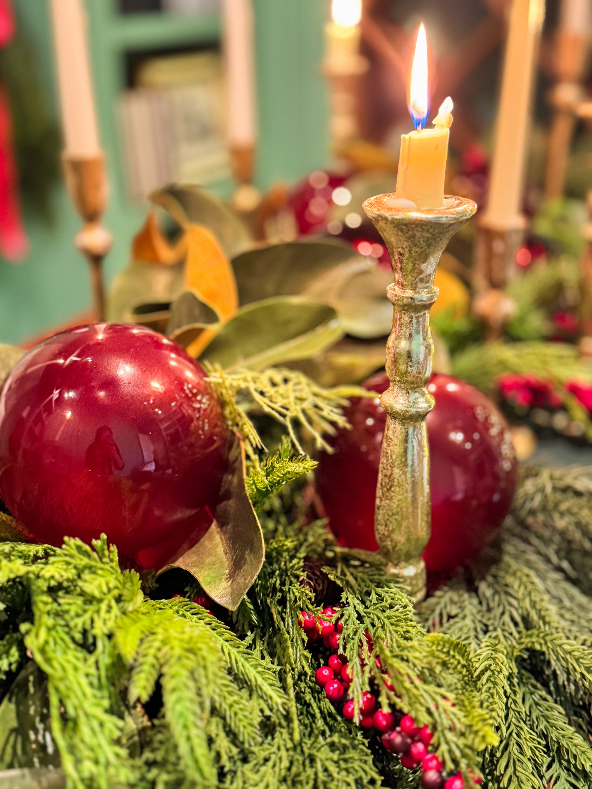 ✨ Designer Tip: Layer your favorite brass or silver candlesticks through the center and let the glow reflect off the red glass for a warm, classic Ralph Lauren holiday feel.