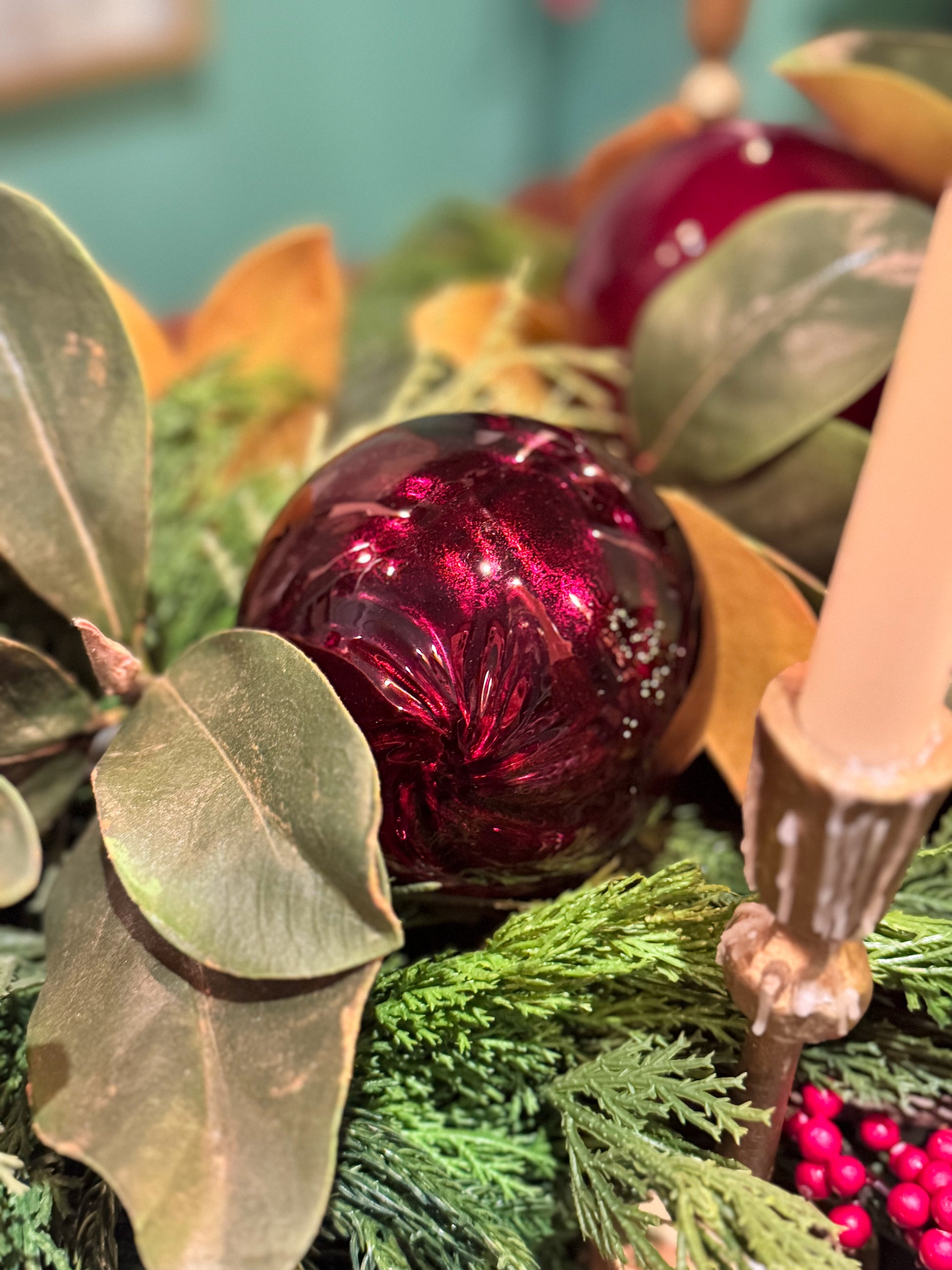 Hand-blown crimson glass ornaments nestle among real-touch greenery, magnolia leaves, pinecones, and berry stems to bring depth, warmth, and elegance to your table. Whether you’re hosting candlelit dinners or simply styling your home for the season, this box transforms any surface into a scene of sophisticated Christmas charm.