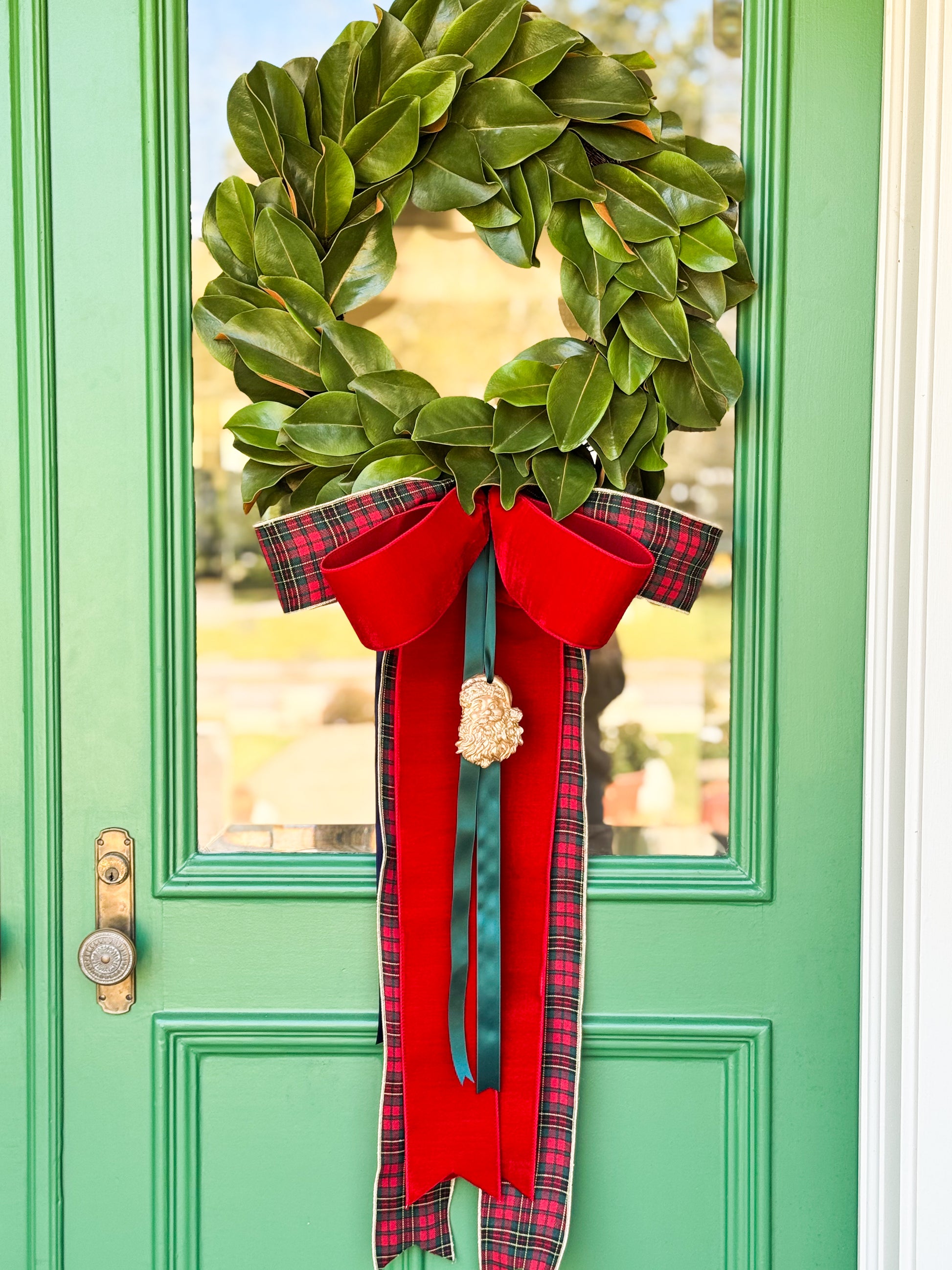 A door dressed in Ralph Lauren Christmas style. The RL Noël Magnolia Wreath & Bow pairs the rich, glossy leaves of real-touch magnolia with a striking tartan and velvet ribbon sash — finished with a gold Santa medallion for that unmistakable touch of heritage charm.