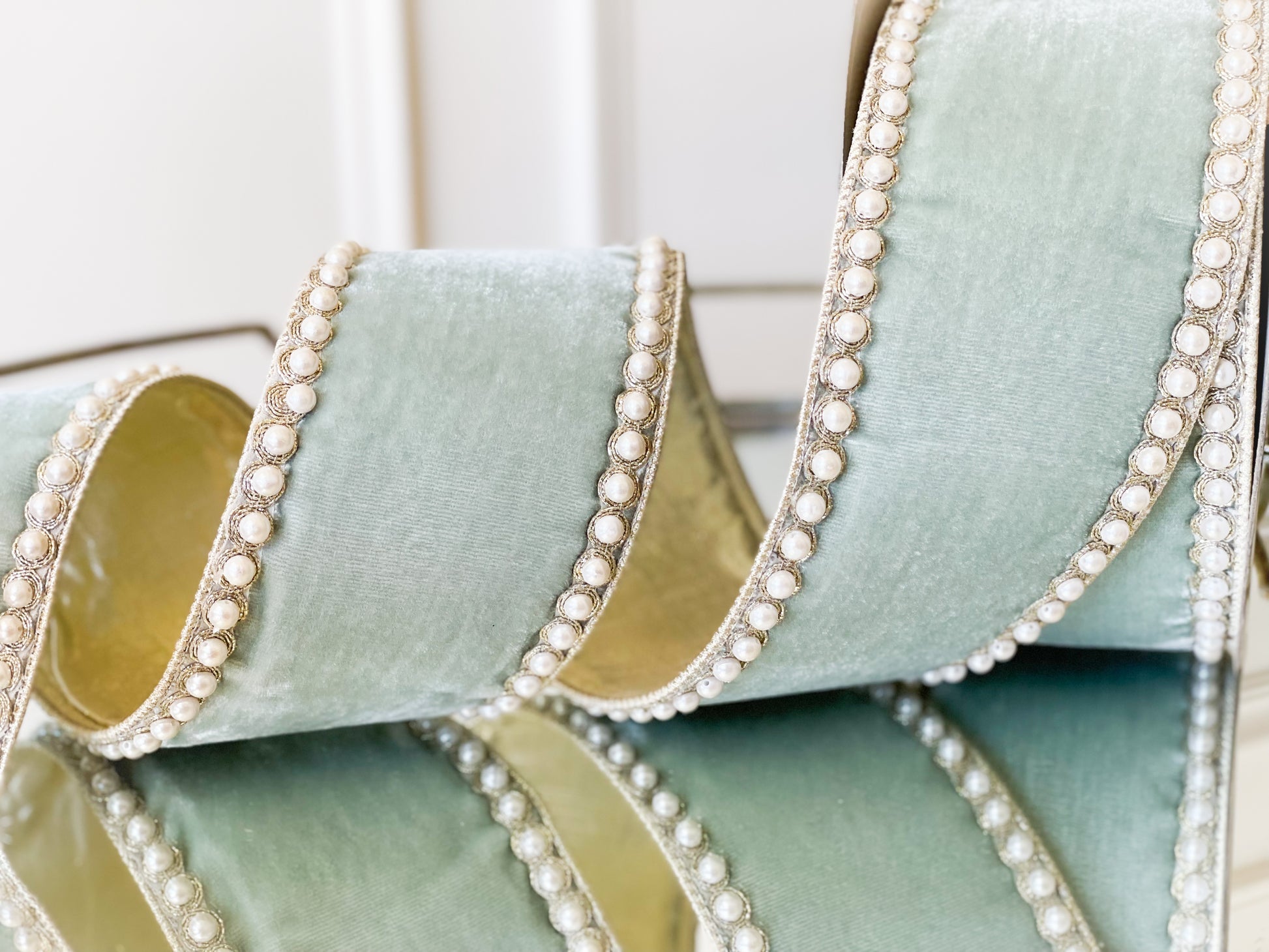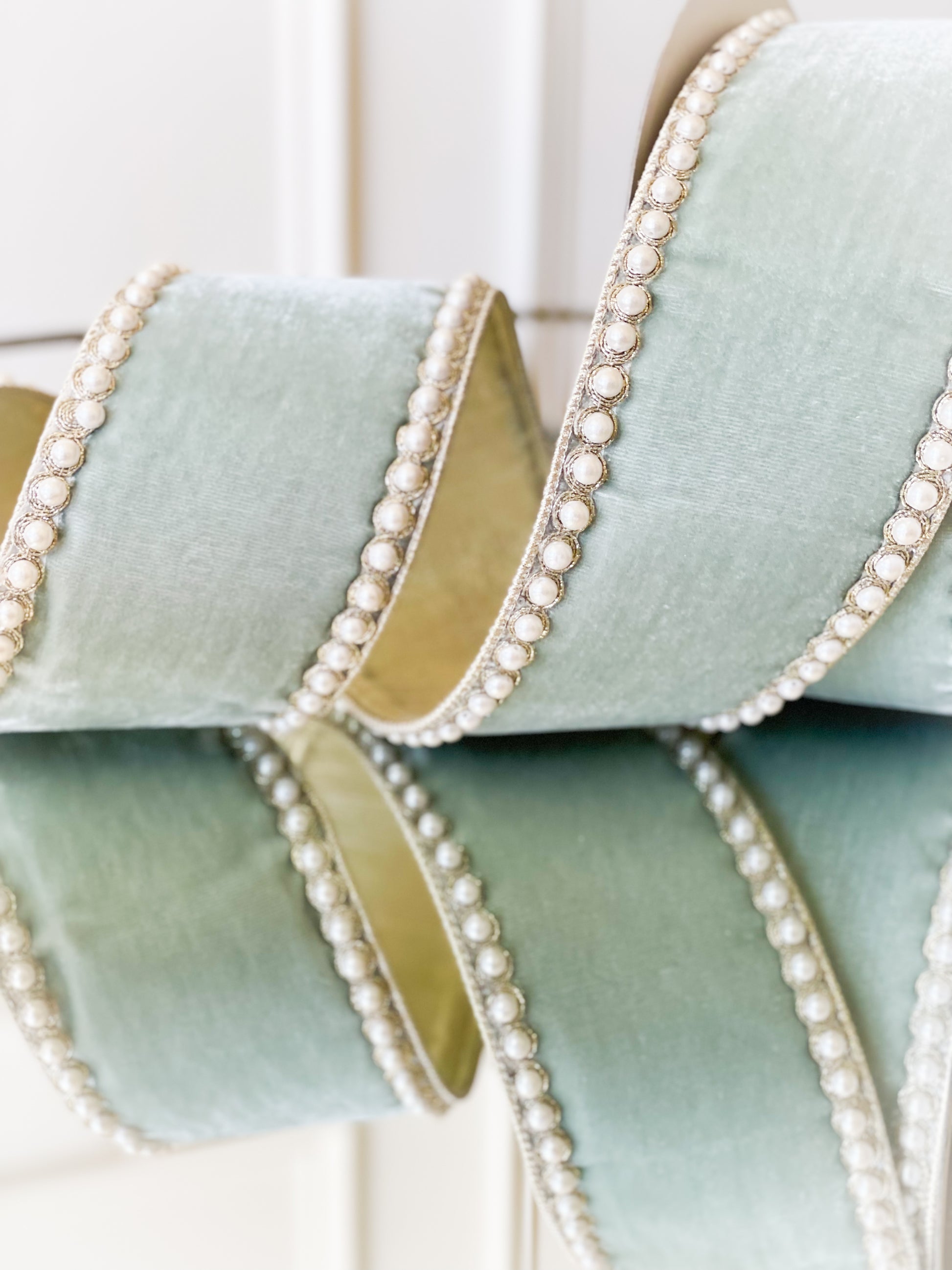 Seafoam Velvet With Pearl Border Ribbon (Preorder) 4”x5yd
