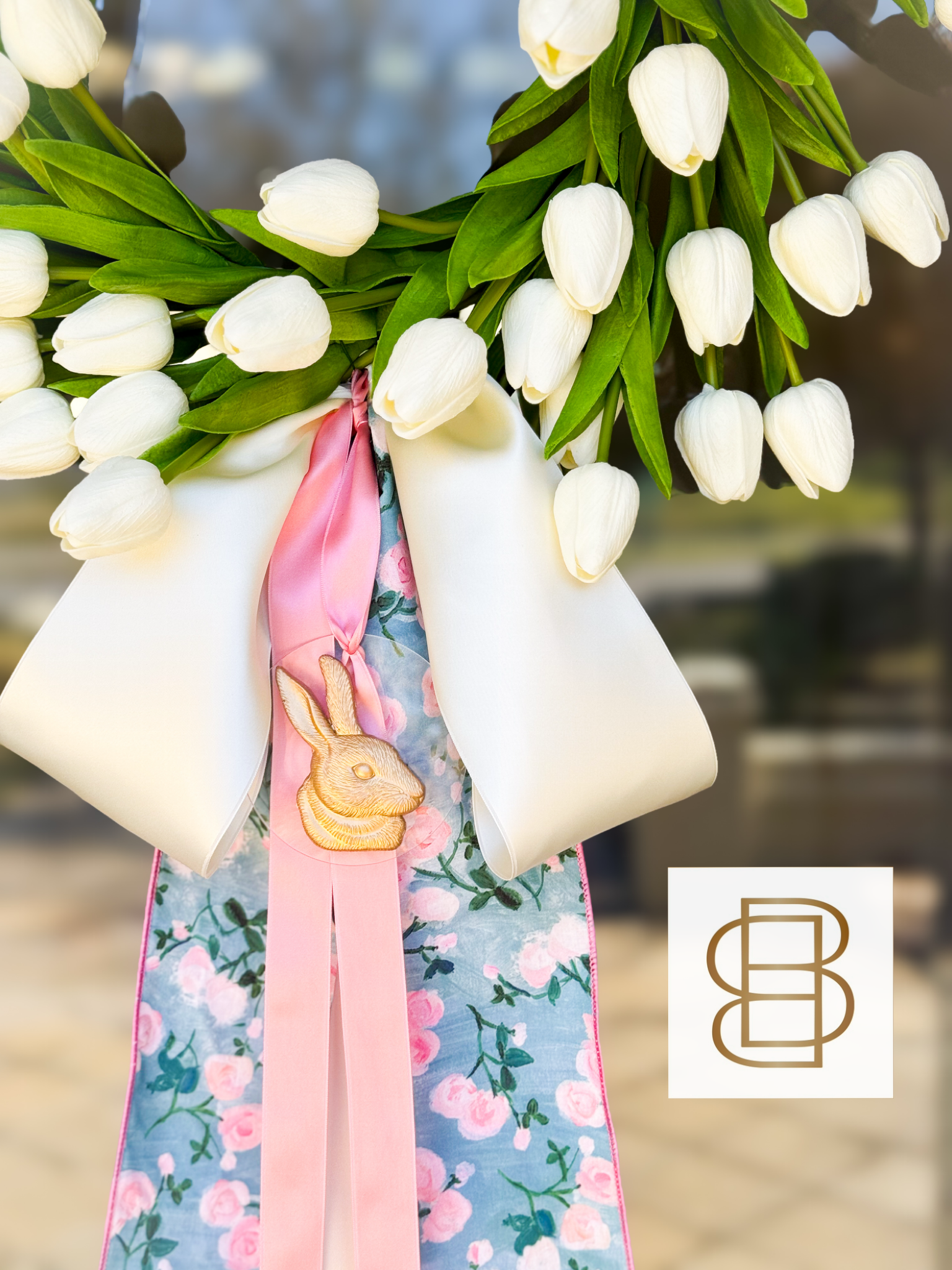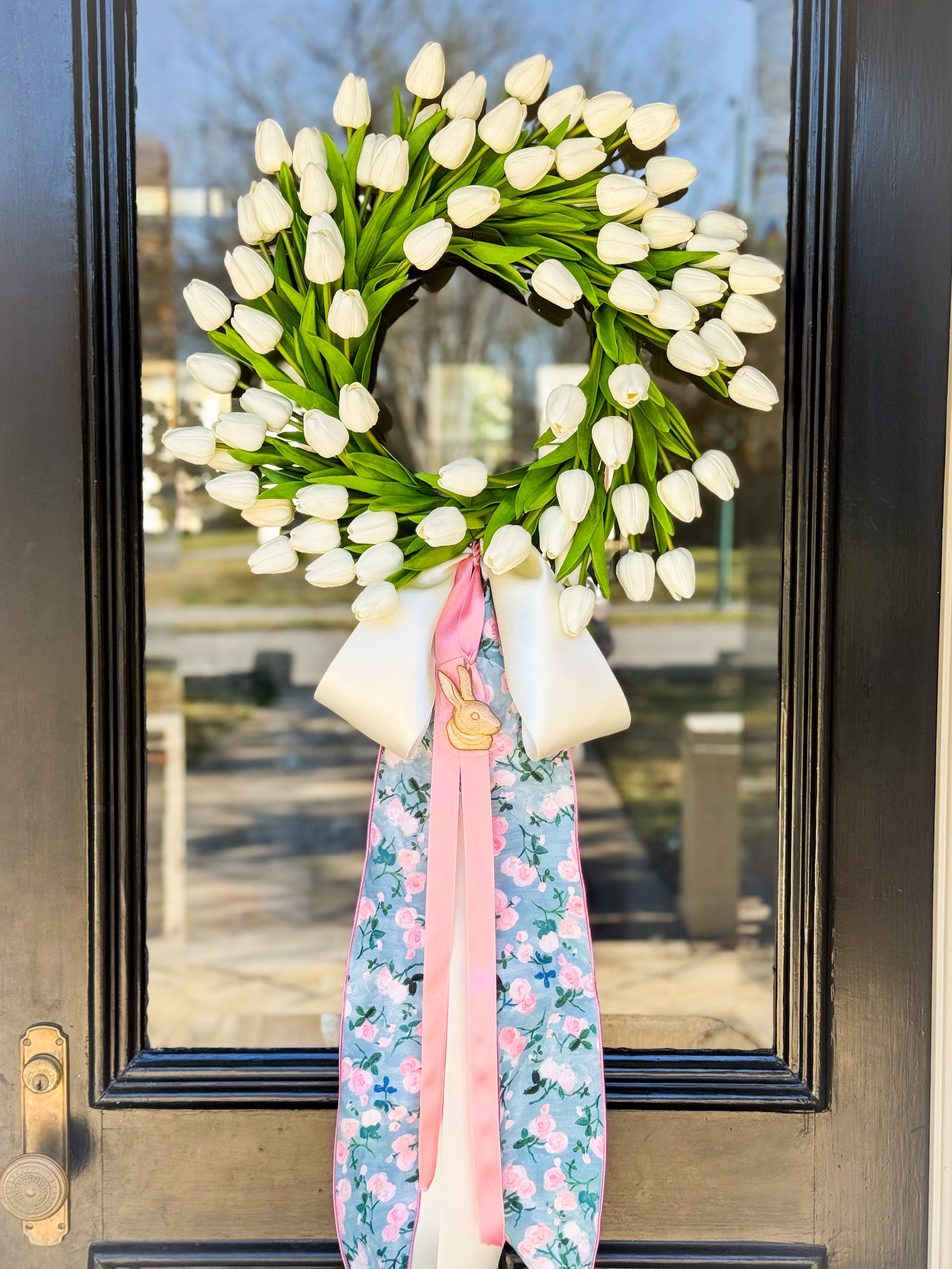 The Serenity White Real Touch Tulip Cottontail Wreath With A Rose Garden Floral Layered Sash And Cottontail Hand Poured Ornament Is An Elegant Way To Welcome To Welcome Your Guests This Spring. This High Quality Wreath Will Not Disappoint.