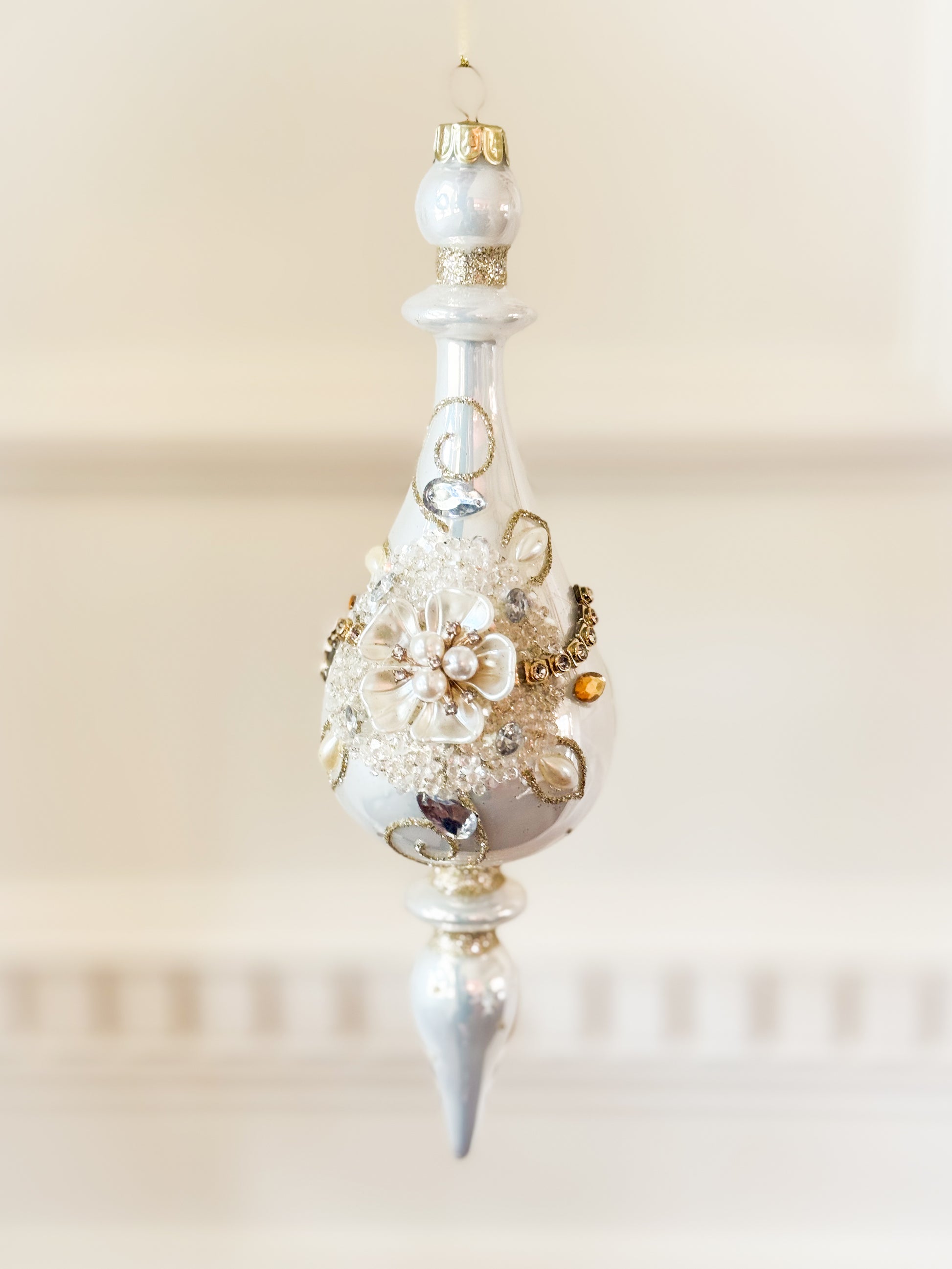 Grace your holiday tree with the exquisite elegance of our Gilded Petal Finial Ornaments — a stunning fusion of artistry and opulence. Each 10-inch glass finial ornament features a luminous pearl-white finish adorned with intricate floral embellishments, sparkling crystal accents, and golden scrollwork.