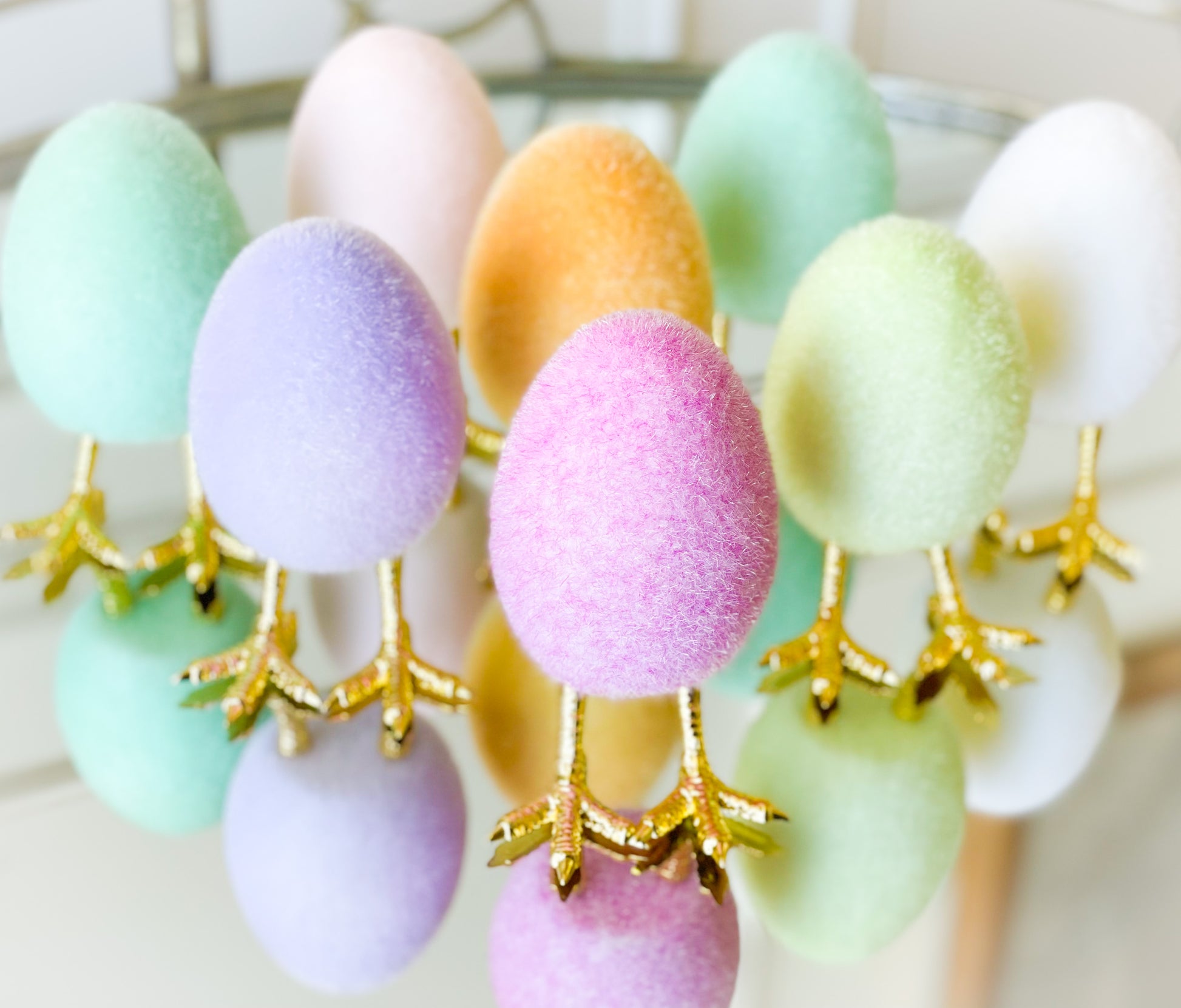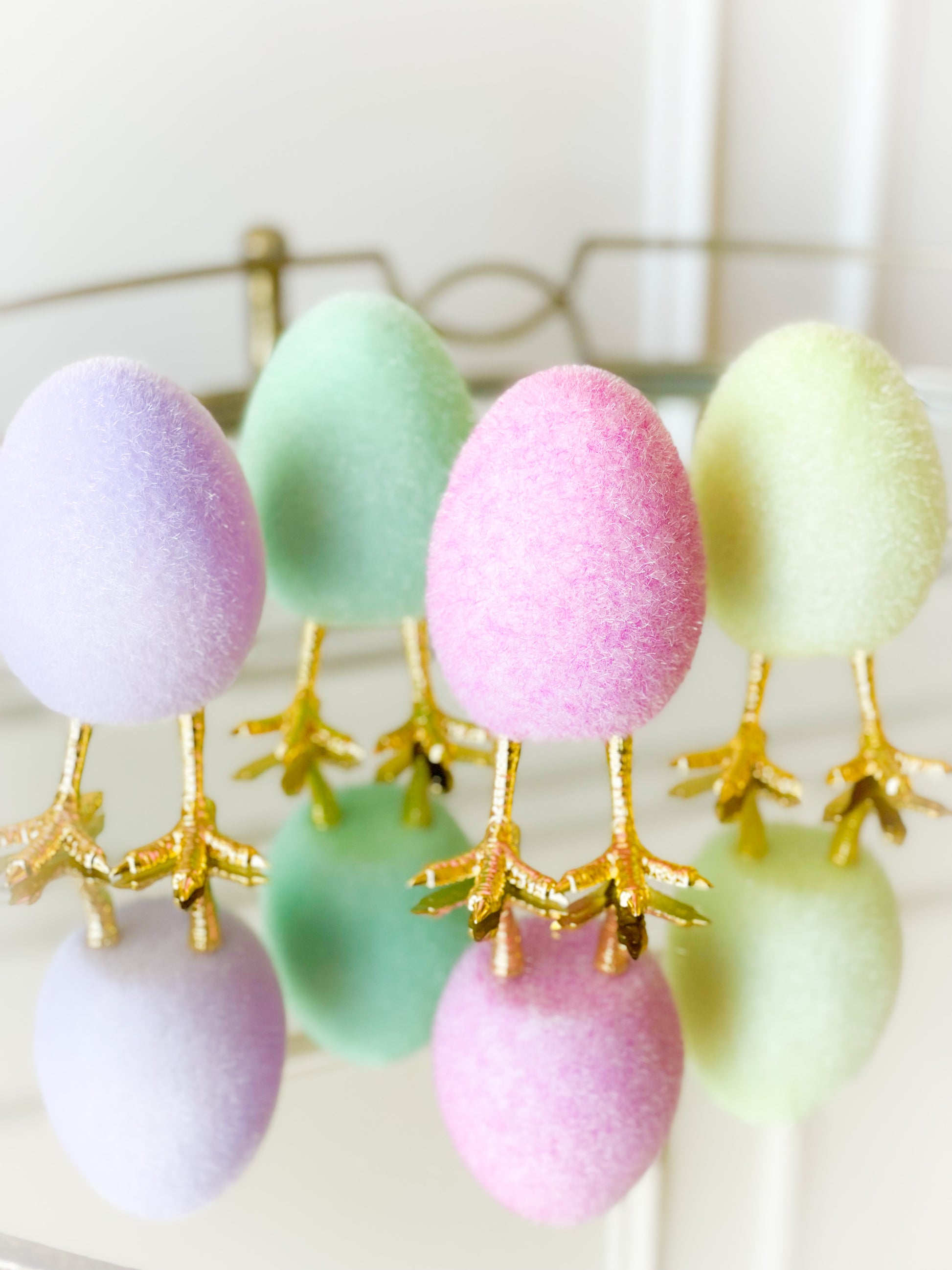 Set Of Four Flocked Eggs With Gold Feet 5.5”-6”, Lavender, Pink, Mint, Lime