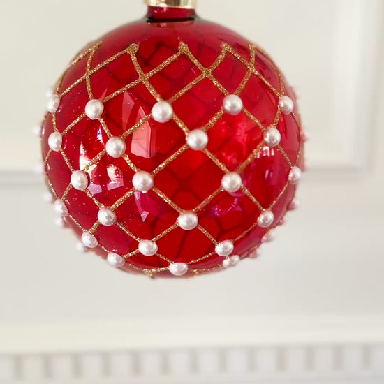 Add a touch of timeless glamour to your holiday décor with our Ruby Luxe Pearl Trellis Ornament. Measuring 4.75 inches, this exquisite glass ornament features a radiant red finish adorned with a delicate lattice of shimmering gold glitter. Each intersection is beautifully accented with lustrous pearl embellishments, creating an elegant, jewel-like effect that sparkles from every angle. Perfect for traditional, vintage, or luxe holiday themes, this ornament brings sophisticated charm to any tree, wreath, or garland.