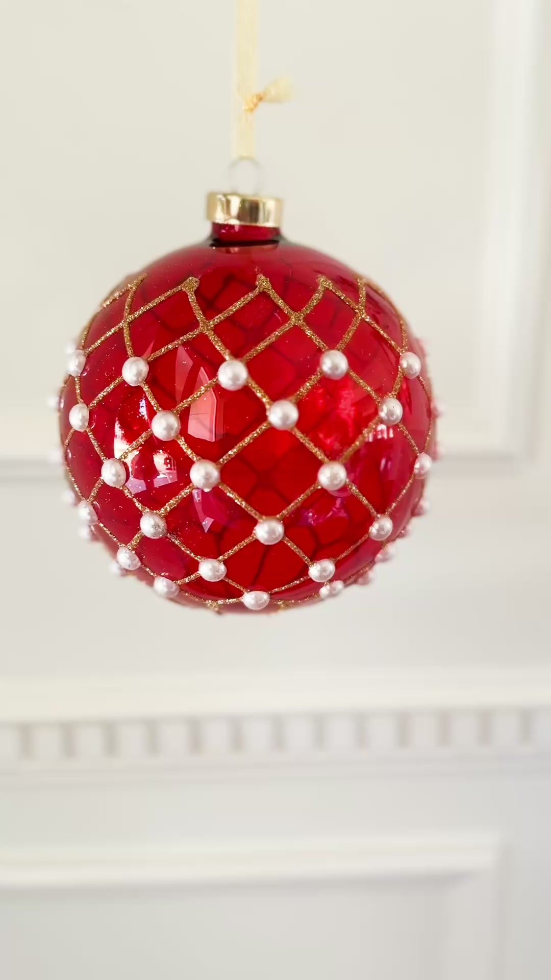 🎄 Finish: Glossy red glass with gold glitter and pearl details