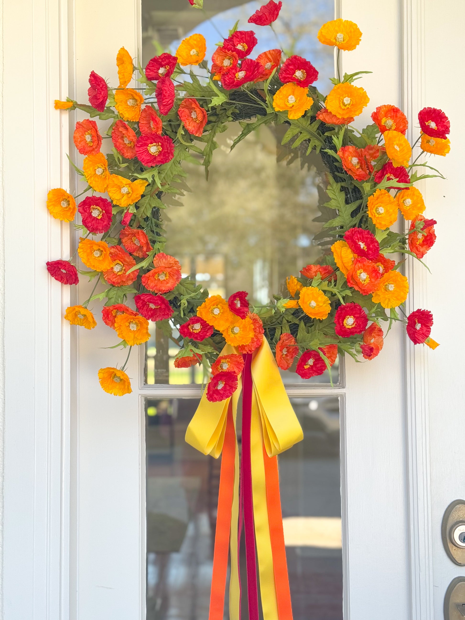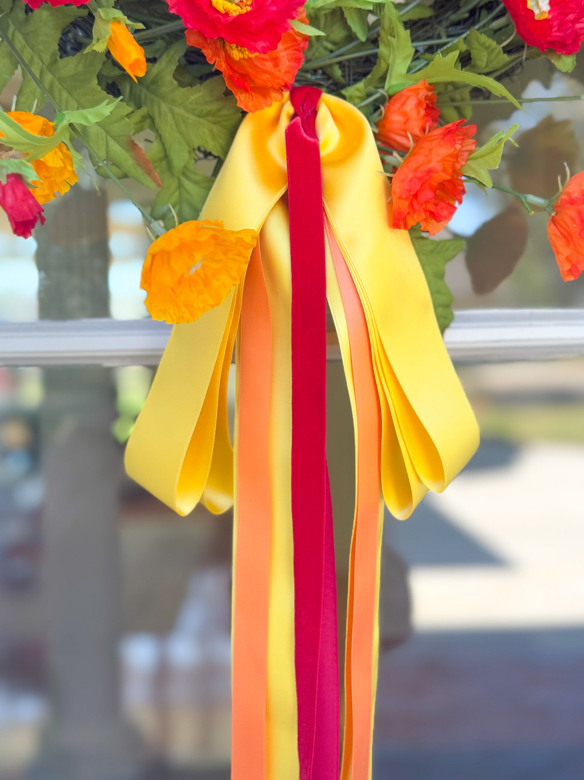 The Sunset Floral Blissful Bow Wreath Is The Perfect Summer Soirée Decor. Shades Of Yellow And Orange Mimic A Summer Sunset Giving This Design A Rich, Deep Color Scheme.