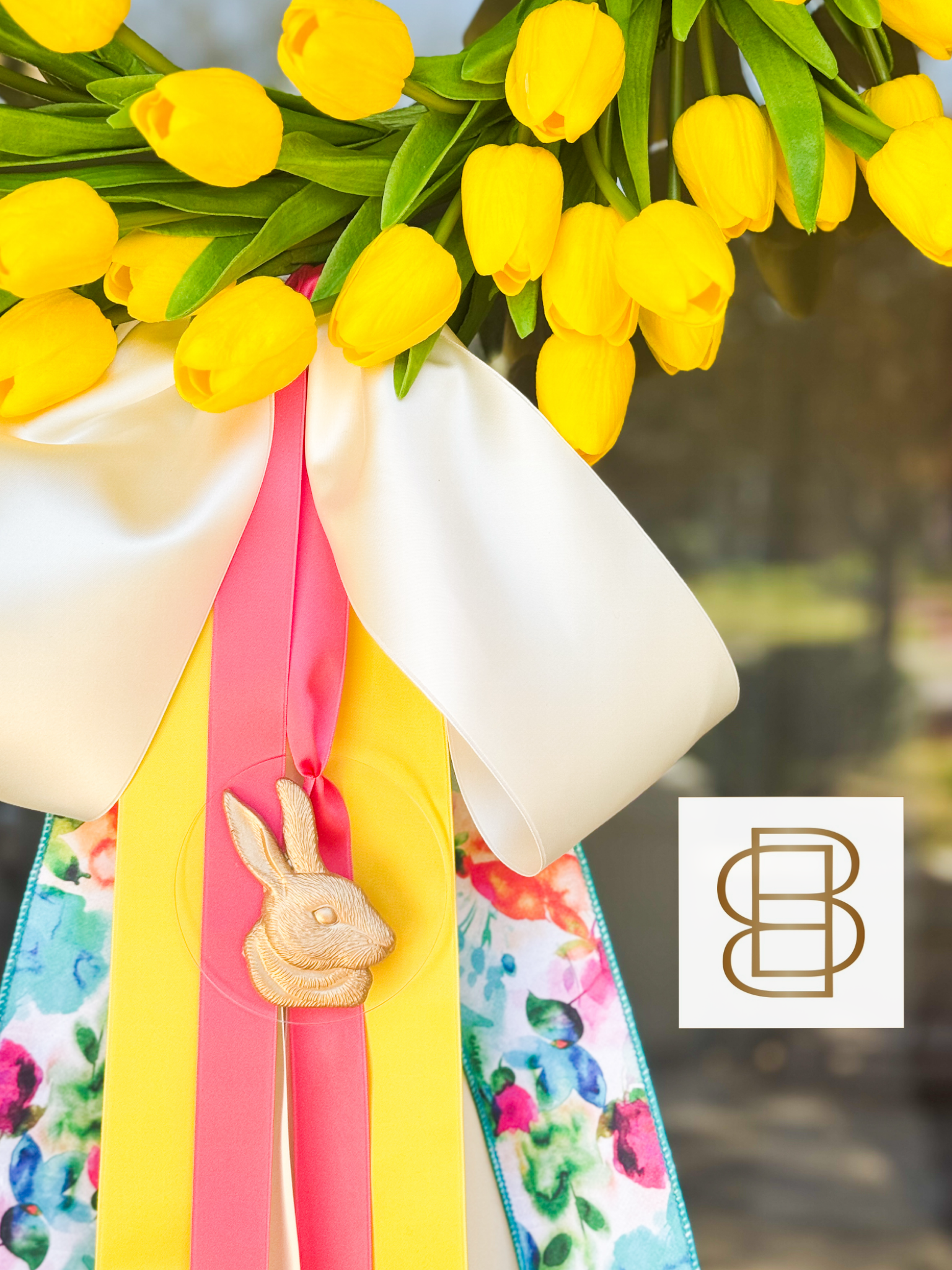 The Sunshine Yellow Real Touch Tulip Cottontail Wreath With A Vibrant Floral Layered Sash And Cottontail Hand Poured Ornament Is A Bright Way To Welcome Spring.