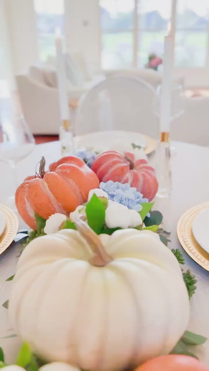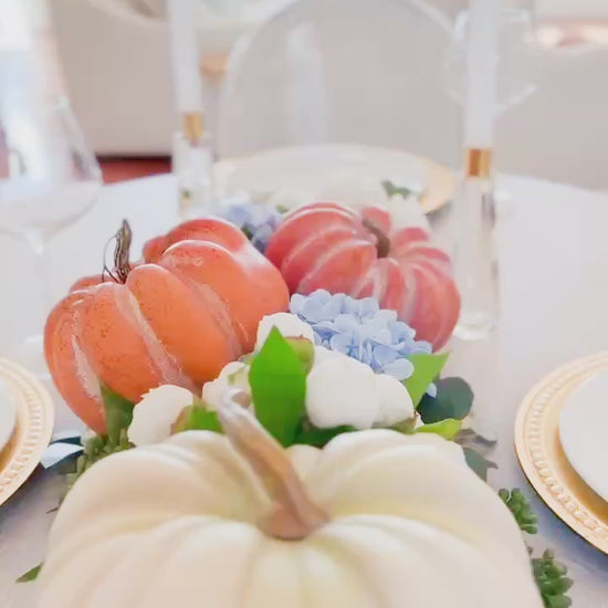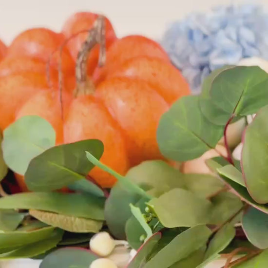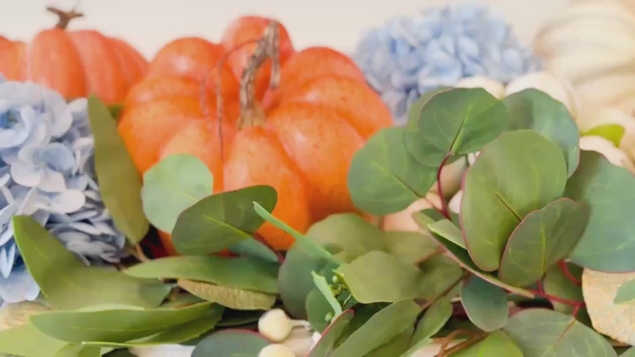 This versatile curated décor box blends the warmth of heirloom pumpkins with the soft romance of ivory blooms and the unexpected elegance of sky-blue hydrangeas. Golden eucalyptus accents complete the look, creating a luxe balance of autumnal charm and timeless sophistication.