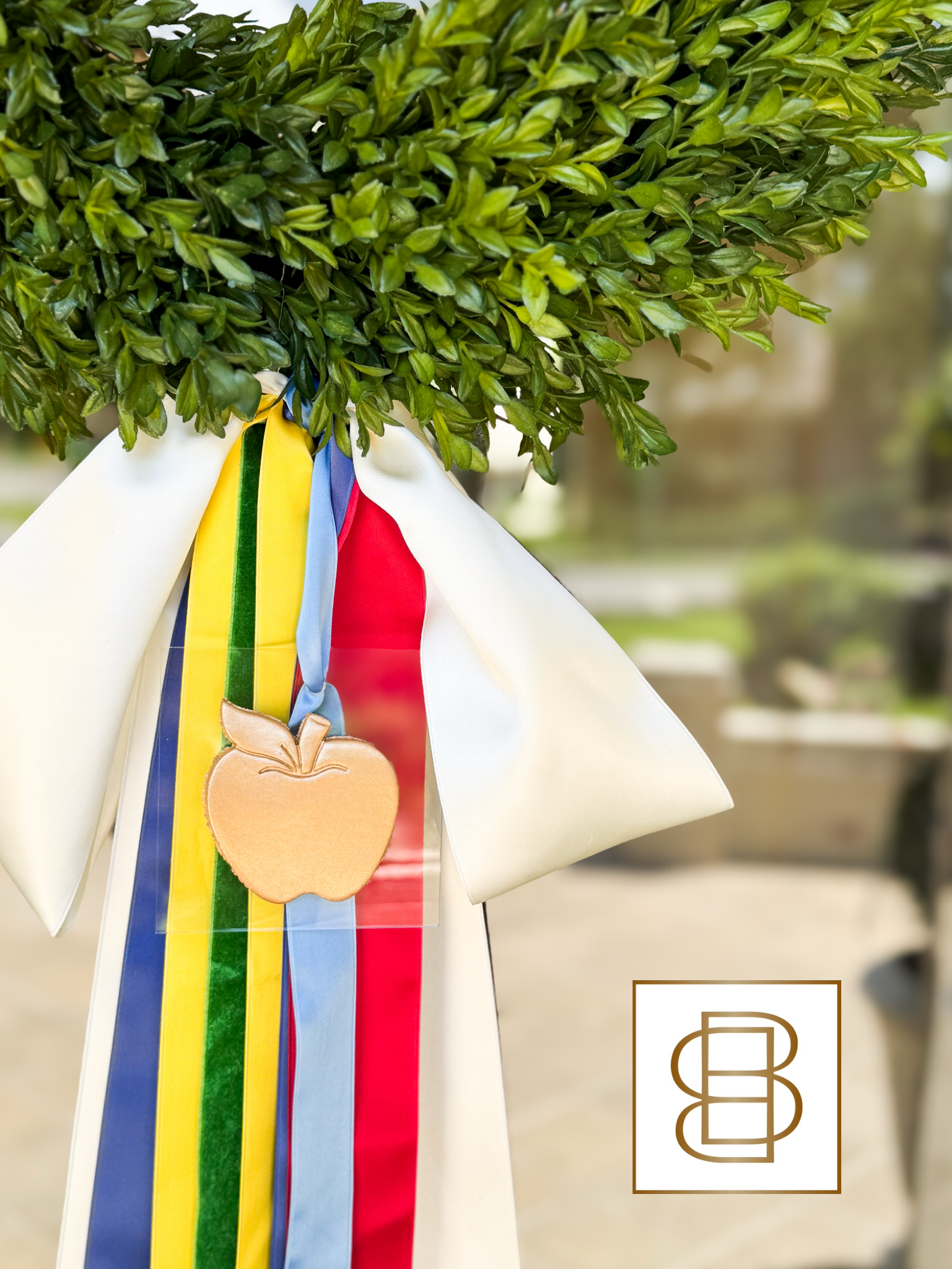 Start the school year in style with our Backpacks and Bows wreath — a cheerful nod to fresh starts and first-day fun. Featuring a lush green faux boxwood base, this wreath is adorned with a crisp white bow and playful, school-inspired ribbon tails in vibrant primary colors. A golden apple charm adds the perfect teacher-approved finishing touch.