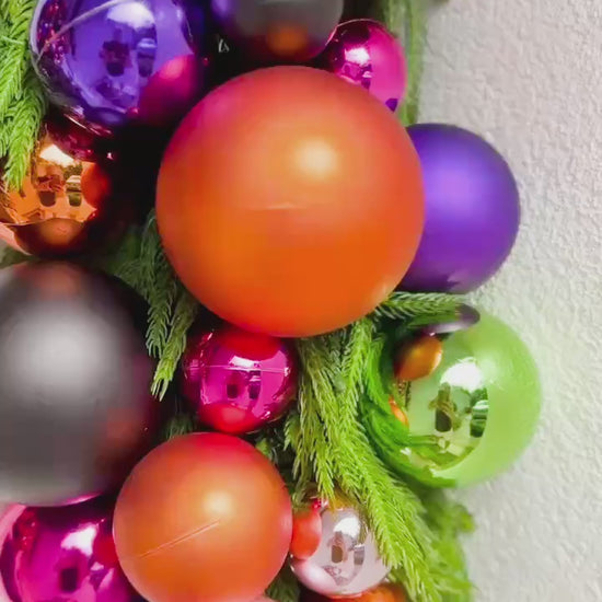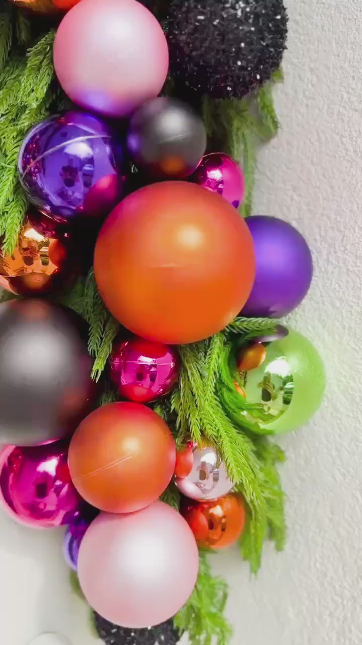 - Striking baubles in electric pink, haunting green, deep violet, jet black, fiery orange, and shimmering silver for a bold, festive palette.