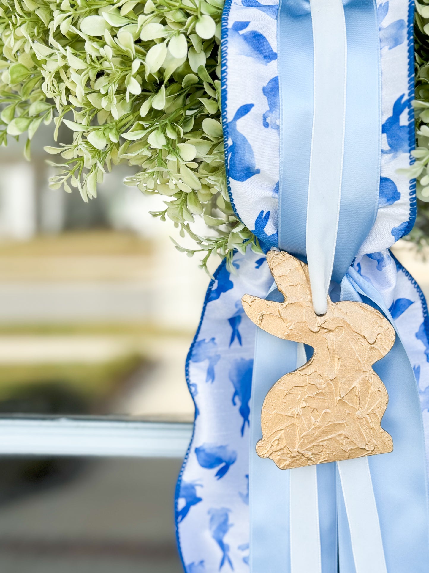 The Cottontail 22” Cream And Green Boxwood Wreath And Layered Ribbon Sash With Handmade Gold Bunny Ornament