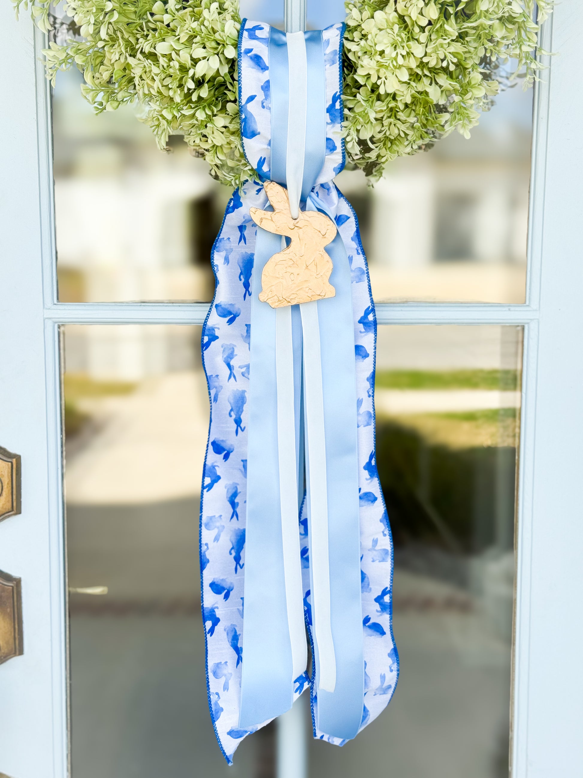 The Cottontail 22” Cream And Green Boxwood Wreath And Layered Ribbon Sash With Handmade Gold Bunny Ornament